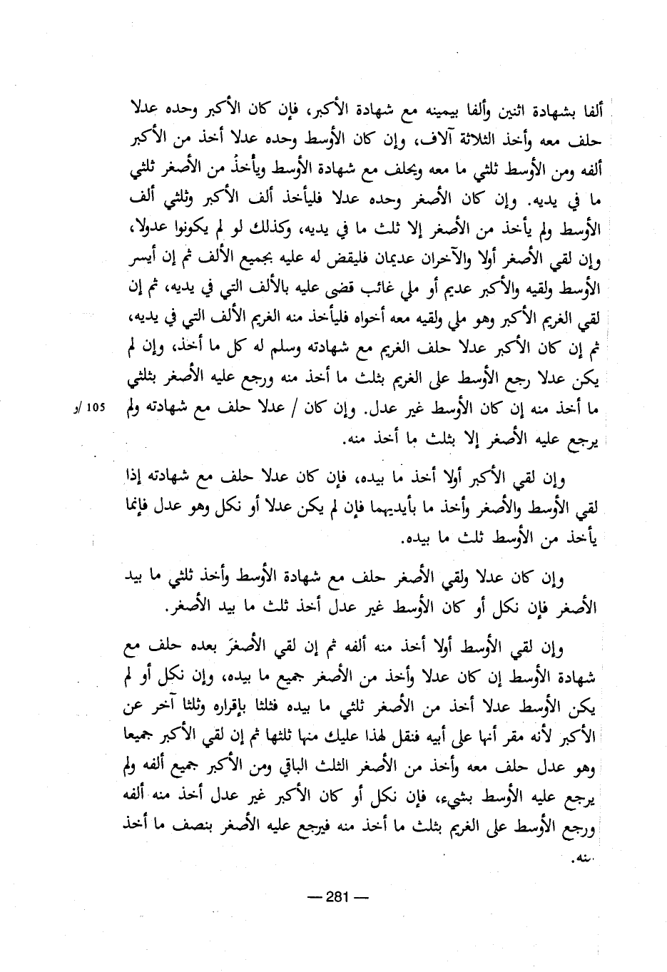 ألفا بشهادة اثنين وألفا بيمينة مع شهادة الأكبر، فإن كان الأكبر وحدة عدلا حلف معة وأخ\ الثلاثة آلاف، وإن كان الأوسط وحدة عدلا أخذ من الأكبر ألفة ومن الاوسط ثلثى ما معة ويحلف مع شهادة الأوسط ويأخذ من الأصغر ثلثى ما فى يدية. وإن كان الأصغر وحدة عدلا فليأخذ ألف الأكبر وثلثى ألف الأوسط ولم يأخذ من الأصغر إلا ثلث ما فى يدية، وكذلك لو لم يكونوا عدولا، وإن لقى الأصغر أولا والآخران عديمان فليقض لة علية بجميع الألف ثم إن أيسر الأوسط ولقية والأكبر عديم أو ملى غائب قضى علية بالألف التى فى يدية، ثم إن لقى الغريم الأكبر وهو ملى ولقية معة أخواة فليأخذ منة الغريم الألف التى فى يدية، ثم إن كان الأكبر عدلا حلف الغريم مع شهادتة وسلم لة كل ما أخذ، وإن لم يكن عدلا رجع الأوسط على الغريم بثلث ما أخذ منة ورجع علية الأصغر بثلثى ما أخذ منة إن كان الأوسط غير عدل. وإن كان / عدلا حلف مع شهادتة ولم 105/ويرجع علية الأصغر إلا بثلث ما أخذ منة. وإن لقى الأكبر أولا ما أخذ ما بيدة، فإن كان عدلا حلف مع شهادتة إذا لقى الأوسط والأصغر وأخذ ما بأيديهما فإن لم يكن عدلا أو نكل وهو عدل فإنما يأخ\ من الأوسط ثلث ما بيدة. وإن كان عدلا ولقى الأصغر حلف مع شهادتة الأوسط وأخذ ثلثى ما بيد الأصغر فإن نكل أو كان الأوسط غير عدل أخذ ثلث ما بيد الأصغر. وإن لقى الأوسط أولا أخذ منة ألفة ثم إن لقى الأصغر بعدة حلف مع شهادة الأوسط إن كان عدلا وأخذ من الأصغر جميع ما بيدة، وإن نكل أو لم يكن الأوسط عدلا أخذ من الأصغر ثلثى ما بيدة فثلثا بإقرارة وثلثا آخر عن الأكبر لأنة مقر أنها على أبية فنقل لهذا عليك منها ثلثها ثم إن لقى الأكبر جميعا وهو عدل حلف معة وأخذ من الأصغر الثلث الباقى ومن الأكبر جميع ألفة ولم يرجع علية الأوسط بشىء، فإن نكل أو كان الأكبر غير عدل أخذ منة ألفة ورجع الأوسط على الغريم بثلث ما أخذ منة فيرجع علية الأصغر بنصف ما أخذ منة.