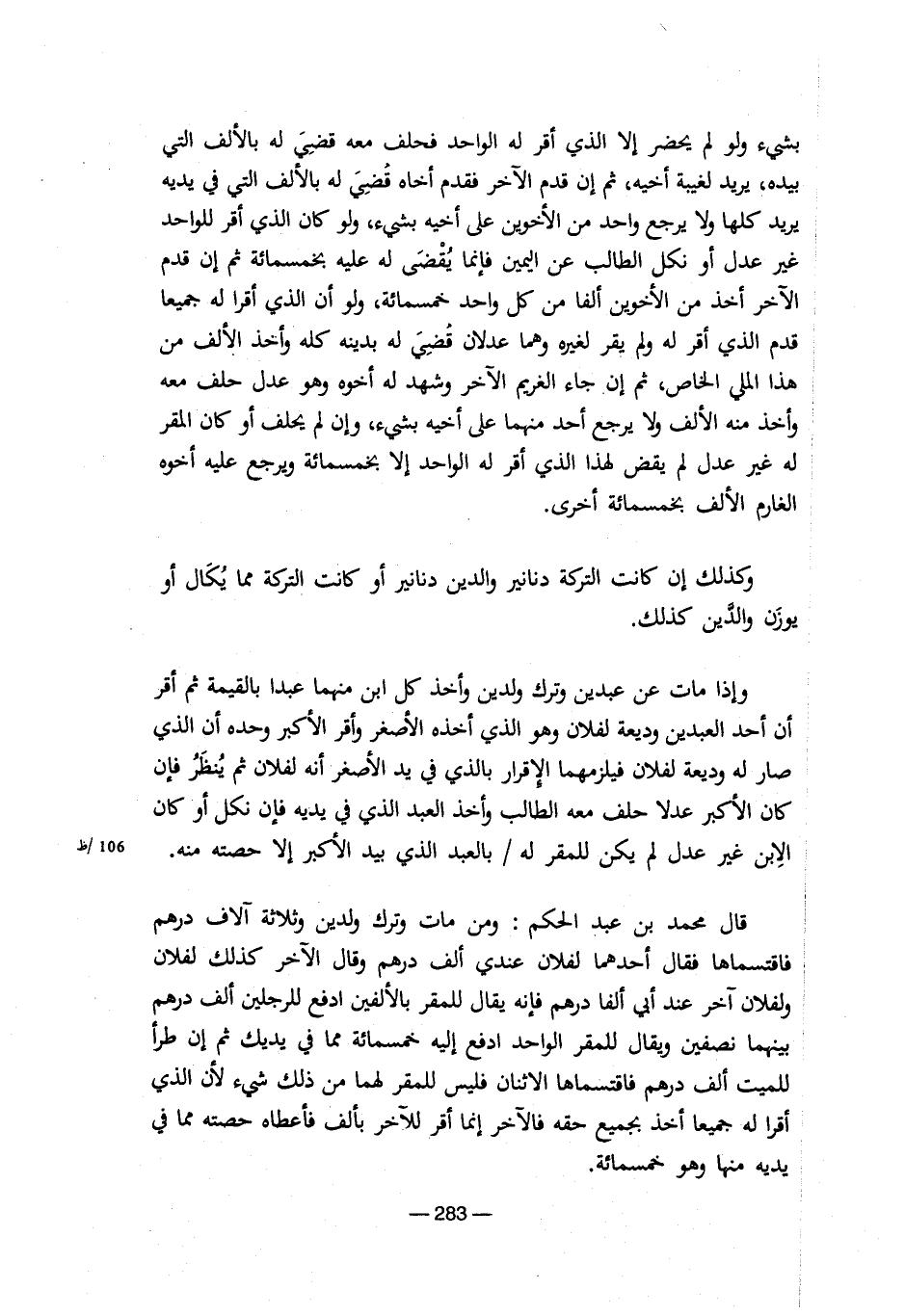 بشىء ولو لم يحضر إلا الذى أقر لة الواحد فحلف معة قضى لة بالألف التى بيدة، يريد لغيبة أخية، ثم إن قدم الآخر فقدم أخاة قضى له بالألف التى بيده، يريد لغيبة أخية، ثم إن قدم الاخر فقدم أخاه قضي له بالألف التى في يدية يريد كلها ولا يرجع واحد من الأخوين على أخيه بشئ، ولو كان الذي أقر للواحد غير عدل أو نكل الطالب عن اليمين فإنما يقضي له عليه بخمسمائة ثم إن قدم الآخر أخذ من الأخويين ألفاً من كل واحد خمسمائة، ولو أن أقرا له جميعا قدم الذي أقر له ولم يقر لغيره وهما عدلان قضي له بدينه كله وأخذ الألف من هذا الملي الخاص، ثم إن جاء الغريم الآخر وشهد له أخوه وهو عدل حلف معه وأخذ منه الألف ولا يرجع أحد منهما على أخيه منهما أخيه بشئ، وإن يحلف أو كان المقر له غير عدل لم يض لهذا الذي أقر له الواحد إلا بخمسمائة ويرجع عليه أخوه الغارم الألف بخمسمائة أخري.