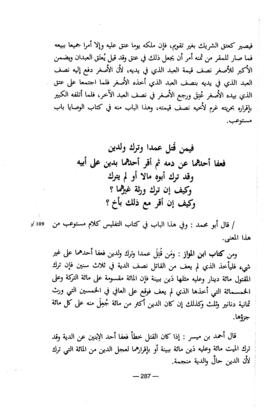 فيصير كعتق الشريك بغير تقويم، فإن ملكة يوما عتق علية وإلا أمرا جميعا ببيعة فما صار للمقر من ثمنة أمر أن يجعل ذلك فى عتق وقد قيل يعتق العبدان ويضمن الأكبر للأصغر نصف قيمة العبد الذى فى يدية، لأن الأصغر دفع إلية نصف العبد الذى فى يدية بنصف العبد الذى أخذة الأصغر فلما اجتمعا على عتق الذى بيدة الأصغر عتق ورجع الأصغر فى نصف العبد الآخر، فلما أتلفة الكبير بإقرارة بحريتة غرم لأخية نصف قيمتة، وهذا الباب منة فى كتاب الوصايا باب مستوعب. فيمن قتل عمدا وترك ولدين فعفا أحدهما عن دمة ثم أقر أحدهما بدين على أبية وقد ترك أبوة مالا أو لم يترك وكيف إن ترك ورثة غيرهما؟ وكيف إن أقر مع ذلك بأخ؟ /قال أبو محمد: وفى هذا الباب فى كتاب التفليس كلام مستوعب من 109/وهذا المعنى. ومن كتاب ابن المواز: ومن قتل عمدا وترك ولدين فعفا أحدهما على غير شىء فليأخذ الذى لم يعف من القاتل نصف الدية فى ثلاث سنين فإن ترك المقتول مائة دينار وعلية مثلها دين ببينة فإن المائة مقسومة على مائة التركة وعلى الخمسمائة التى أخذها الذى لم يعف فوقع على العافى فى الخمسين التى ورث ثمانية دنانير وثلث وكذلك إن كان الدين أكثر من مائة جعل منة على كل مائة جزؤها. قال أحمد بن ميسر: إذا كان القتل خطأ فعفا أحد الابنين عن الدية وقد ترك الميت مائة ببينة أو بإقرارهما لعجل الدين من المائة التى ترك لأن الدين حال والدية منجمة.