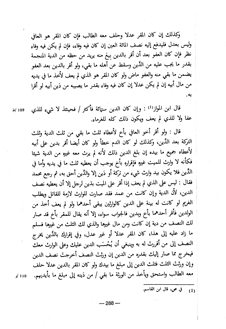 وكذلك إن كان المقر عدلا وحلف معة الطالب فإن كان المقر هو العافى وليس بعدل فليدفع إلية نصف المائة العين إن كان فية وفاء، فإن لم يكن فية وفاء نظر فإن كان العفو بعد أن أقر بالدين بيع منة يريد من حظة من الدية المنجمة بقدر ما يجب علية من الدين وسقط عن أهلة ما بقى، ولو أقر بالدين بعد العفو يضمن ما بقى منة والعفو ماض ولو كان المقر هو الذى لم يعف لأخذ ما فى يدية من مال أبية إن لم يكن عدلا إن كان فية وفاء بقدر ما يصيبة من دين أبية لو أقرا قال ابن المواز (¬1): وإن كان الدين ستمائة فأكثر / فحينئذ لا شىء للذى 109/ظ عفا ولا للذى لم يعف ويكون ذلك كلة للغرماء. قال: ولو أقر أخو العافى بأخ لأعطاه ثلث ما بقي من ثلث الدية وثلث التركة بعد الدين، وكذلك لو كان الدم خطأ ولو كان أيضا أقر بدين على أبيه لأعطاه جميع ما بيده إن بلغ الدين ذلك لأنه لم يرث معه غيره من الدية شيئا فكأنه لا وارث للميت غيره فإقراره بأخ يوجب أن يعطيه ثلث ما في يديه وأما في الدين فلا يكون بيد وارث شئ من تركة أو دين إلا والدين أحق به، ثم رجع محمد فقال: ليس على الذي لم يعف إذا أقر على الميت بدين لرجل إلا أن يعطيه نصف الدسن، لن الدية وإن كانت من عمد فقد صارت للوارث لازمة للقاتل ويطلب الغريم لو كانت له بينة على الدين كالوارثين يبقي أحدهما ولو لم يعف أخذ من الولدين فأقر أحدهما بأخ وبدين فالجواب سواء، إلا أنه يقال للمقر بأخ قد صار لك النصف من دية إن كانت ومن مال غيرها والذي والذي لك الثلث من غيرها فسلم مازاد عليه إلي هذا، كان المقر عدلا أو غير عدل، وفي إقراراك بالدين يخرج النصف إلي من أقررت له به وينبغي أن يحسب الدين عليك وعلي الوارث معك فيخرج مما صار إليك بقدره من الدين إن ورثت النصف أخرجت نصف الدين وإن ورثت الثلث فثلت الدين إلي مبلغ ما بيدك ولو كان المقر بالدين عدلا حلف معه الطالب واستحق ويأخذ من الورثة ما بقي / من دينه إلي مبلغ ما بأيديهم. 110/و