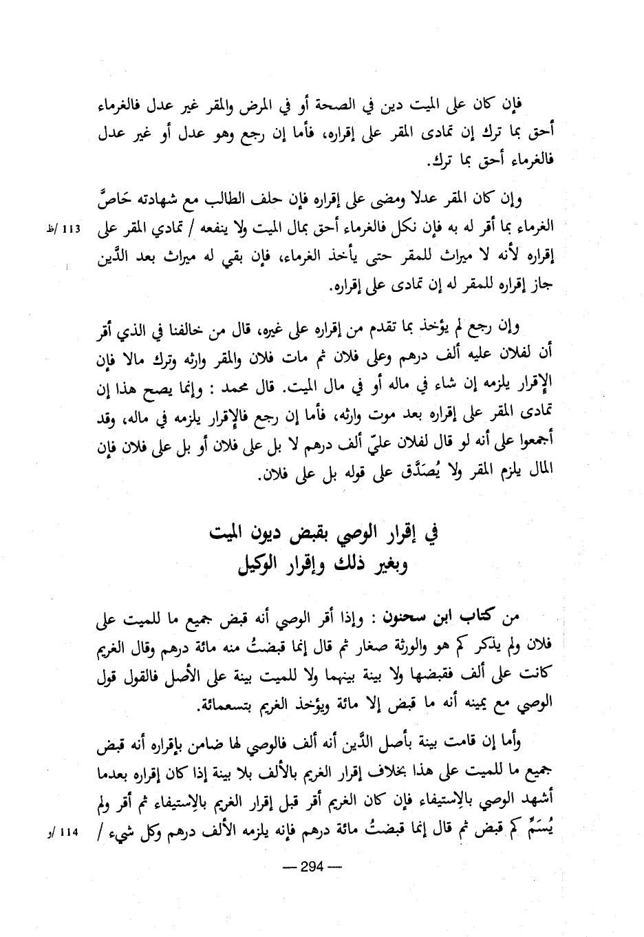 فإن كان على الميت دين فى الصحة أو فى المرض والمقر غير عدل فالغرماء أحق بما ترك إن تمادى المقر على إقرارة، فأما إن رجع وهو عدل أو غير عدل فالغرماء أحق بما ترك. وإن كان المقر عدلا ومضى على إقرارة فإن حلف الطالب مع شهادتة حاص الغرماء بما أقر لة بة فإن نكل فالغرماء أحق بمال الميت ولا ينفعة / تمادى المقر على 113/ظ إقرارة لأنة لا ميراث للمقر حتى يأخذ الغرماء، فإن بقى لة ميراث بعد الدين جاز إقرارة للمقر لة إن تمادى على إقرارة. وإن رجع لم يؤخذ بما تقدم من إقرارة، قال من خالفنا فى الذى أقر أن لفلان علية ألف درهم وعلى فلان ثم مات فلان والمقر وارثة وترك مالا فإن الإقرار يلزمة إن شاء فى مالة أو فى مال الميت. قال محمد: وإنما يصح هذا إن تمادى المقر على إقرارة بعد موت وارثة، فأما إن رجع فالإقرار يلزمة فى مالة، وقد أجمعوا على أنة لو قال لفلان على ألف درهم لا بل على فلان أو بل على فلان فإن المال يلزم المقر ولا يصدق على قولة بل على فلان. فى إقرار الوصى بقبض ديون الميت وبغير ذلك وإقرار الوكيل من كتاب ابن سحنون: وإذا أقر الوصى أنة قبض جميع ما للميت على فلان ولم يذكر كم هو والورثة صغار ثم قال إنما قبضت منة مائة درهم وقال الغريم كانت على ألف فقبضها ولا بينة بينهما ولا للميت بينة على الأصل فالقول قول الوصى مع يمينة أنة ما قبض إلا مائة ويؤخذ الغريم بتسعمائة. وأما إن قامت بينة بأصل الدين أنة ألف فالوصى لها ضامن بإقرارة أنة قبض جميع ما للميت على هذا بخلاف إقرار الغريم بالألف بلا بينة إذا كان إقرارة بعدما أشهد الوصى بالاستيفاء فإن كان الغريم أقر قبل إقرار الغريم بالاستيفاء ثم أقر ولم يسم كم قبض ثم قال إنما قبضت مائة درهم فإنة يلزمة الألف درهم وكل شىء / 114/و