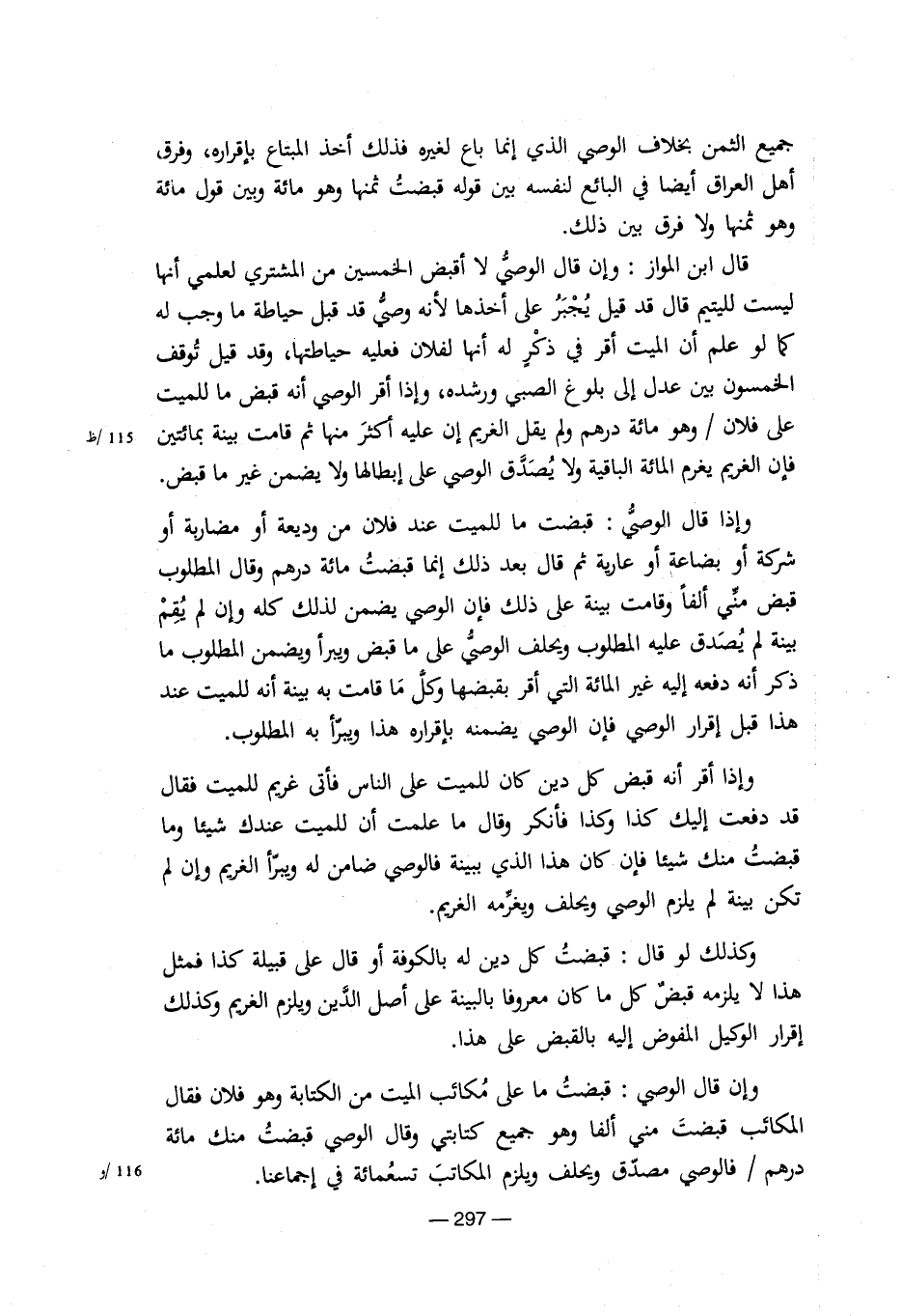 جميع الثمن بخلاف الوصى الذى إنما باع لغيرة فذلك أخذ المبتاع بإقرارة، وفرق أهل العراق أيضا فى البائع لنفسة بين قولة قبضت ثمنها وهو مائة وبين قول مائة وهو ثمنها ولا فرق بين ذلك. قال ابن المواز: وإن قال الوصى لا أقبض الخمسين من المشترى لعلمى أنها ليست لليتيم قال قد قيل يجبر على أخذها لأنة وصى قد قبل حياطة ما وجب لة كما لو علم أن الميت أقر فى ذكر لة أنها لفلان فعلية حياطتها، وقد قيل توقف الخمسون بين عدل إلى بلوغ الصبى ورشدة، وإذا أقر الوصى أنة قبض ما للميت على فلان / وهو مائة درهم ولم يقل الغريم إن علية أكثر منها ثم قامت بينة بمائتين 115/ظ فإن الغريم يغرم المائة الباقية ولا يصدق الوصى على إبطالها ولا يضمن غير ما قبض.