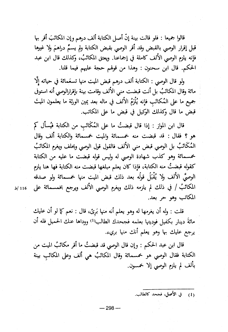 قال ابن عبد الحكم: وإن قال الوصي قد قبضت ما أقر مكائب الميت من الكتابة فقال الوضي هو خمسمائة وقال المكائب هي ألف وعلى المكائب بينة بألف لم يلزم الوصي إلا خمسون.