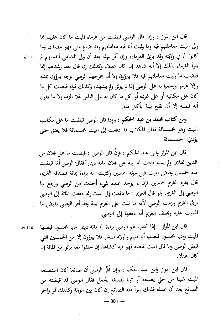 ولى الميت معاملتهم فية وما ليت أنا فية معاملتهم وقد ضاع منى فهو مصدق وما كانوا / فى ولايتة وقد برىء الغرماء، وإن أقر بهذا بعد أن ولى الشامى أنفسهم لم 118/ويبرأ الغرماء بذلك إلا أنة شاهد إن كان عدلا، وكذلك إن قال بعد رشدهم إنما قبضت ما وليت معاملتهم فية فلا يبرؤون إلا أن يخرجهم الوصى بوجة يبرؤون بمثلة وإلا غرموا ورجعوا بة على الوصى إذا لم يوثق ولم يشهد، وكذلك قولة قبضت كل ما كان على مكاتبة أو على غريمة أو كل ما كان لة على الناس فلا يلزمة إلا ما يقول أنة قبضة إلا أن تقوم بينة بأكثر منة.