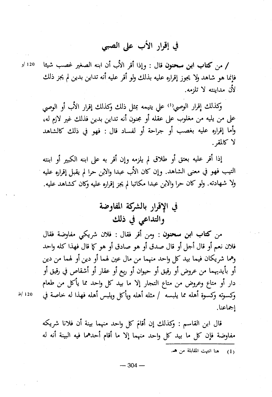 من كتاب ابن سحنون: ومن أقر فقال: فلان شريكى مفاوضة فقال فلان نعم أو قال أجل أو قال صدق أو هو صادق أو هو كما قال فهذا كلة واحد وهما شريكان فيما بيد كل واحد منهما من مال عين لهما أو دين أو لهما من دين أو بأيديهما من عروض أو رقيق أو حيوان أو ربع أو عقار أو أشقاص فى رقيق أو دار أو متاع وعروض من متاع التجار إلا ما بيد كل واحد مما يأكل من طعام وكسوتة وكسوة أهلة مما يلبسة / مثلة أهلة ويأكل ويلبس أهلة فهذا لة خاصة فى 120/ظ إجماعنا.