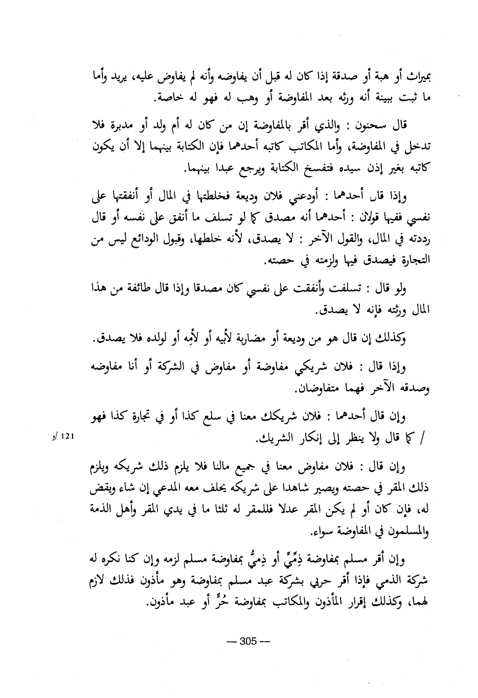وإن قال: فلان مفاوض معنا فى جميع مالنا فلا يلزم ذلك شريكة ويلزم ذلك المقر فى حصتة ويصير شاهدا على شريكة يحلف معة المدعى إن شاء ويقض لة، فإن كان أو لم يكن المقر عدلا فللمقر لة ثلثا ما فى يدى المقر وأهل الذمة والمسلمون فى المفاوضة سواء.