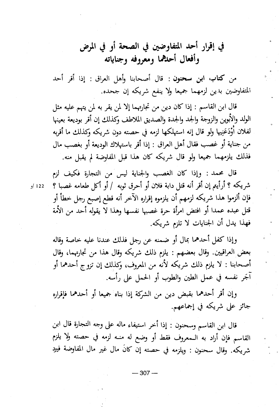 من كتاب ابن سحنون: قال أصحابنا وأهل العراق: إذا أقر أحد المتفاوضين بدين لزمهما جميعا ولا ينفع شريكة إن جحدة.
