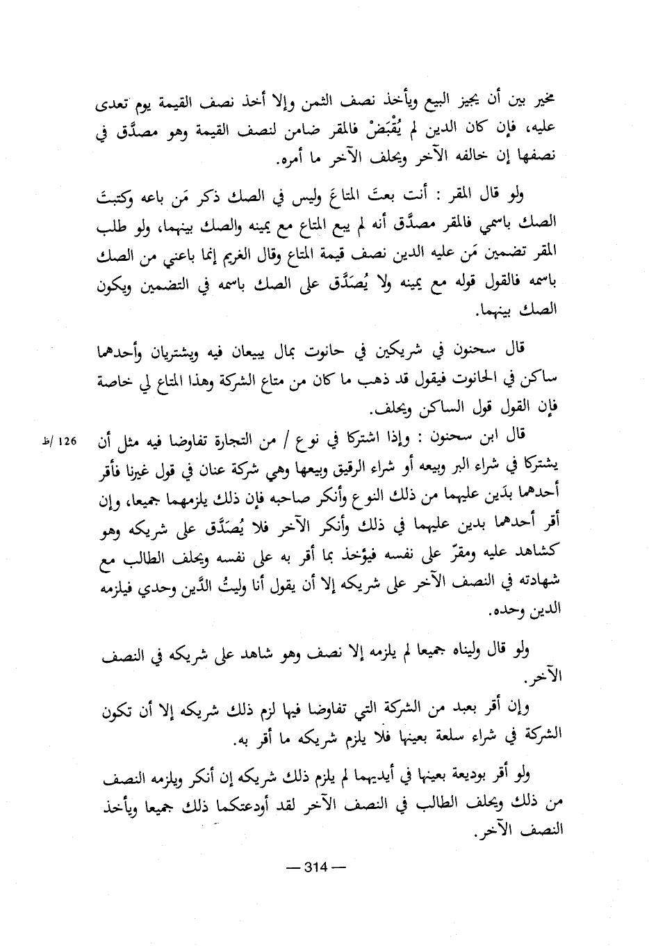 قال ابن سحنون: وإذا اشتركا في نوع / من التجارة تفاوضا فيه مثل أن 126/ ظ يشتركا في شراء البر وبيعه أو شراء الرقيق وبيعها وهي شركة عنان في قول غيرنا فأقر أحدهما بدين عليهما من ذلك النوع وأنكر صاحبه فإن ذلك يلزمهما جميعا، وإن أقر أحدهما بدين عليهما في ذلك وأنكر الآخر فلا يصدق على شريكة وهو كشاهد عليه ومقر على نفسه فيؤخذ بما أفر به على نفسه ويحلف الطالب مع شهادته في النصف الآخر على شريكة إلا أن يقول أنا وليت الدين وحدي فيلزمة الدين وحده.