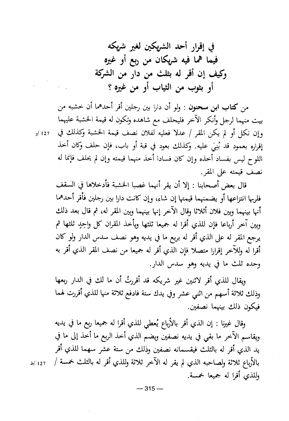 وقال غيرنا: إن الذي أقر بالأرباع يعطي للذي أقرا له جميعا ربع ما في يديه ويقاسم الآخر ما بقي في يديه نصفين ويضم الذي أخذ الربع ما أخذ إلي ما في يد الذي أقر له بالثلث فيقتسمانة نصفين وذلك من ستة عشر سهما للذي أقر بالأرباع ثلاثة ولصاحبه الذي لم يقر له الآخر ثلاثة وللذي أقر له بالثلث خمسة / 127 /ظ