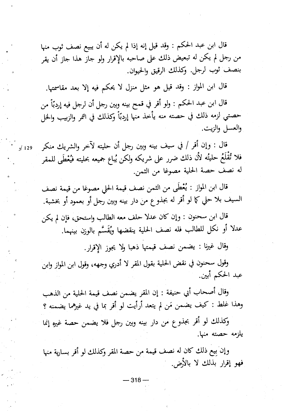 قال ابن عبد الحكم: وقد قيل إنه إذا لم يكن له ان يبيع نصف ثوب منها من رجل لم يكن له تبعيض ذلك على صاحبة بالإقرار ولو جاز أن يقر بنصف ثوب لرجل و. وكذلك الرقيق والحيوان.