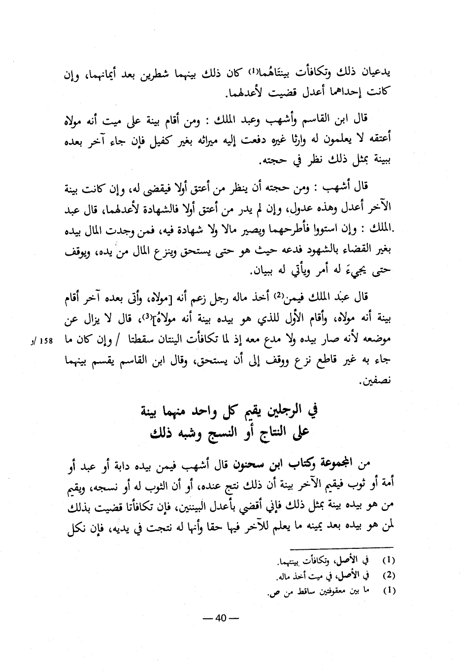 قال أشهب: ومن حجته أن ينظر من أعتق أولا فيقضي له، وإن كانت بينة الآخر أعدل وهذه عدول، وإن لم يدر من أعتق أولا فالشهادة لأعدلهما، قال عبد الملك: وإن استووا فأطرحهما ويصير مالا ولا شهادة فيه، فمن وجدت المال بيده بغير القضاء بالشهود فدعه حيث هو حتي يستحق وينزع المال من يده، ويوقف حتي يجئ له أمر ويأتي له ببيان.