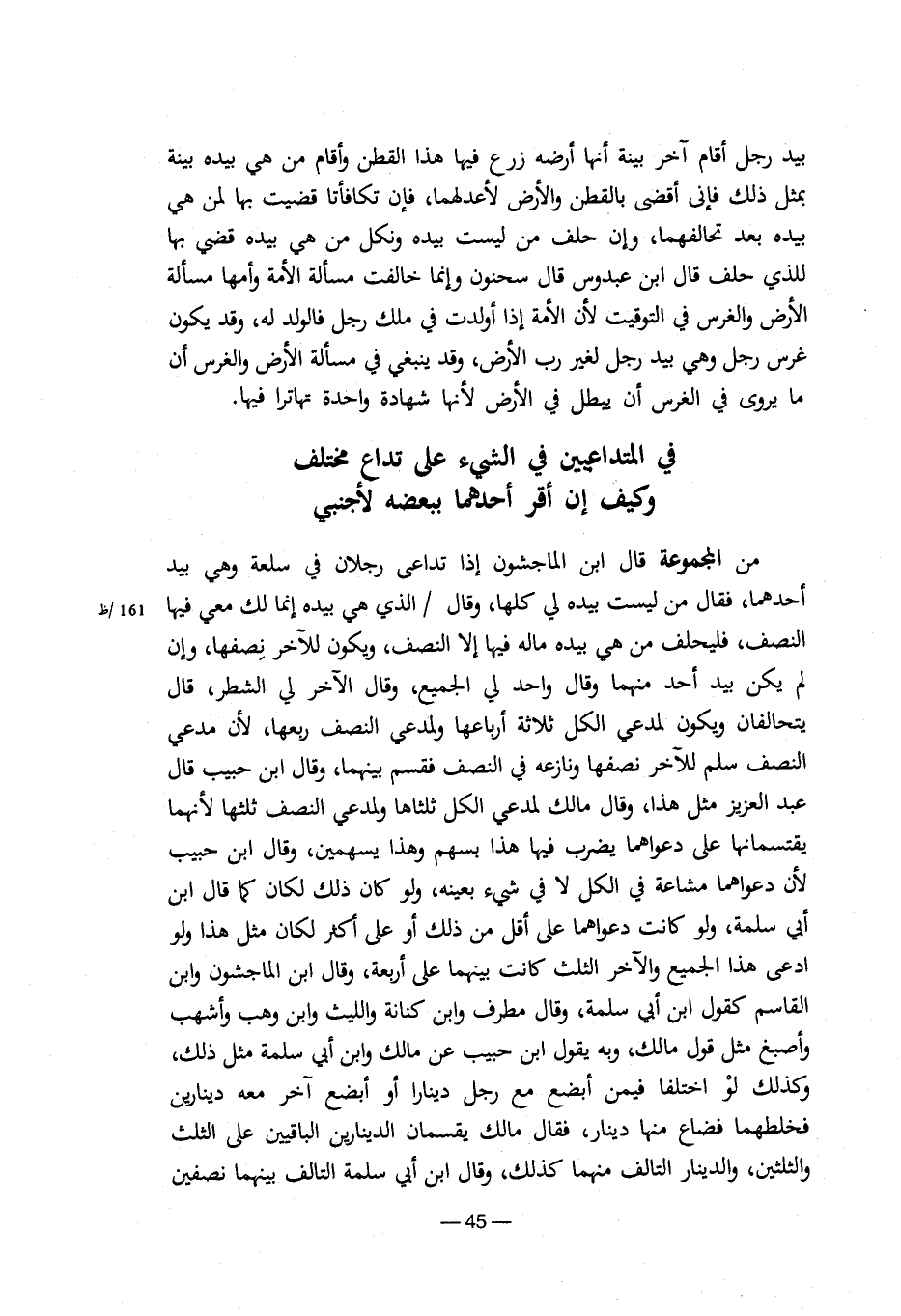من المجموعة قال ابن الماجشون إذا تداعي رجلان في سلعة وهي بيد أحدهما، فقال من ليست بيده لي كلها، وقال/ الذي هي بيده إنما لك معي فيها النصف، فليحلف من هي بيده ماله فيها إلا النصف، ويكن للآخر نصفها، وإن لم يكن بيد أحد منهما وقال واحد لي الجميع، وقال الآخر لي الشطر، قال يتحالفان ويكون لمدعي الكل ثلاثة أرباعها ولمدعي النصف ربعها، لأن مدعي النصف سلم للآخر نصفها ونازعه في النصف فقسم بينهما، وقال ابن حبيب قال عبد العزيز مثل هذا، وقال مالك لمدعي الكل ثلثاها ولمدعي النصف ثلثها لأنهما يقتسمانها علي دعواهما يضرب فيها هذا بسهم وهذا يسهمين، وقال ابن حبيب لأن دعواهما مشاعة في الكل لا في شئ بعينه، ولو كان ذلك لكان كما قال ابن أبس سلمة، ولو كانت دعواهما علي أقل من ذلك أو علي أكثر لكان مثل هذا ولو ادعي هذا الجميع والآخر الثلث كانت بينهما علي أربعة، وقال ابن الماجشون وابن القاسم كقول ابن أبي سلمة، وقال مطرف وابن كنانة والليث وابن وهب وأشهب وأصبغ مثل قول مالك، وبه يقول ابن حبيب عن مالك وابن أبي سلمة مثل ذلك، وكذلك لو اختلفا فيمن أبضع مع رجل دينارا أو أبضع آخر معه دينارين فخلطهما فضاع منها دينار، فقال مالك يقسمان الدينارين الباقين علي الثلث والثلثين، والدينار التالف منهما كذلك، وقال ابن أبي سلمة التالف بينهما نصفين