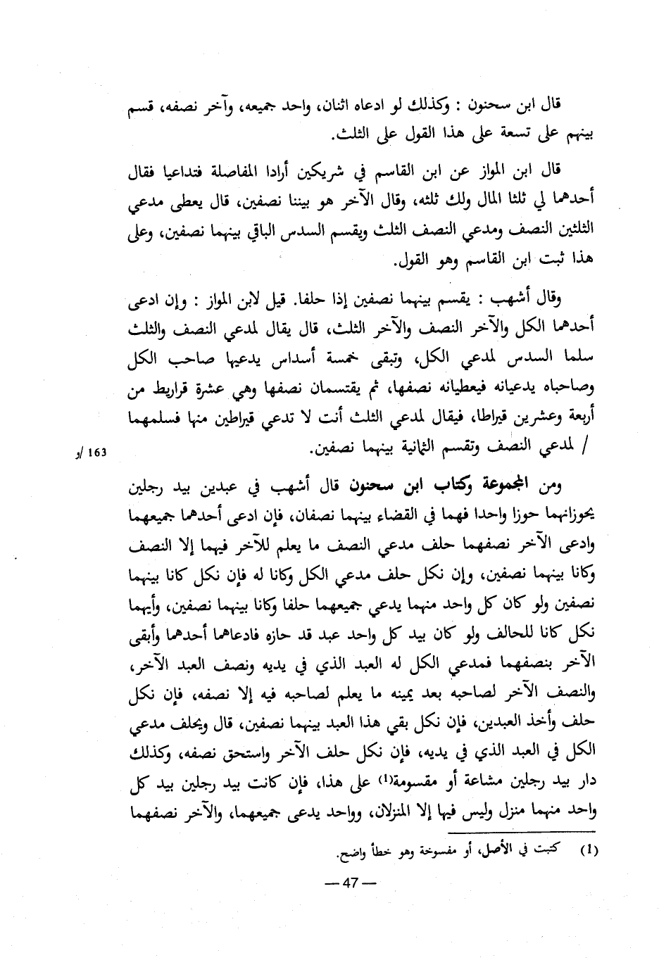 وقال أشهب: يقسم بينهما نصفين إذا حلفا. قبل لابن المواز: وإن ادعي أحدهما الكل والآخر النصف والآخر الثلث، قال يقال لمدعي النصف والثلث سلما السدس لمدعي الكل، وتبقي خمسة أسداس يدعيها صاحب الكل وصاحباه يدعيانه فيعطيانه نصفها، ثم يقتسمان نصفها وهي عشرة قراريط من أربعة وعشرين قيراطا، فيقال لمدعي الثلث أنت لا تدعي قيراطين منها فسلمهما / لمدعي النصف وتقسيم الثمانية بينهما نصفين.