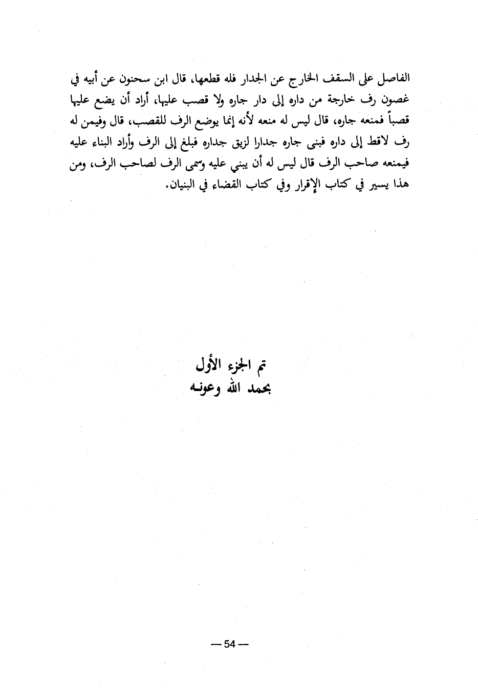 الفاصل علي السقف الخارج عن الجدار فله قطعها، قال ابن سحنون عن أبيه في غصون رف خارجة من داره إلي دار جاره ولا قصب عليها، أراد أن يضع عليها قصباً فمنعه جاره، قال ليس له منعه لأنه إنما يوضع الرف للقصب، قال وفيمن له رف لاقط إلي داره فبني جاره جدارا لزيق جداره فبلغ إلي الرف وأراد البناء عليه فيمنعه صاحب الرف قال ليس له أن يبني عليه وسمي الرف لصاحب الرف، ومن هذا يسير في كتاب الإقرار وفي كتاب القضاء في البنيان.