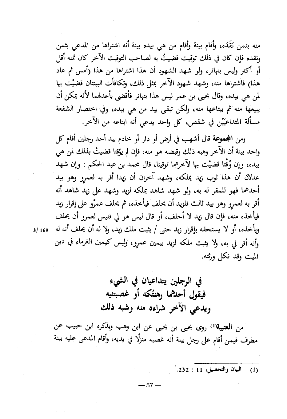 منه بثمن نقده، وأقام بينة وأقام من هي بيده بينة أنه اشتراها من المدعي بثمن ونقده فإن كان في ذلك توقيت قضيت به لصاحب التوقيت الآخر كان ثمنه أقل أو أكثر وليس بتهاتر، ولو شهد الشهود أن هذا اشتراها من هذا (أمس ثم عاج هذا) فاشتراها منه، وشهد شهود الآخر بمثل ذلك، وتكافأت البينتان قضيت بها لمن هي بيده، وقال يحي بن عمر ليس هذا بتهاتر فأقضي بأعدلهما لأنه يمكن أن يبيعها منه ثم يبتاعها منه، ولكن تبقي بيد من هي بيده، وفي اختصار الشفعة مسألة المتداعيين في شقص، كل واحد يدعي أنه ابتاعه من الآخر.