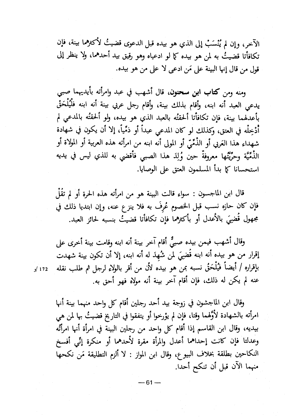 ومنه ومن كتاب ابن سحنون، قال أشهب في عبد وامرأته بأيديهما صبي يدعي العبد أنه ابنه، وأقام بينة، وأقام رجل عربي بينة أنه ابنه فليلحق بأعدلهما بينة، وأقام رجل عربي بينة أنه ابنه امرأته هذه العربية أو المولاة أو الذمية وحريتها معروفة حين ولد هذا الصبي فأقضي به للذي ليس في يديه استحسانا كما بدأ المسلمون العتق علي الوصايا.