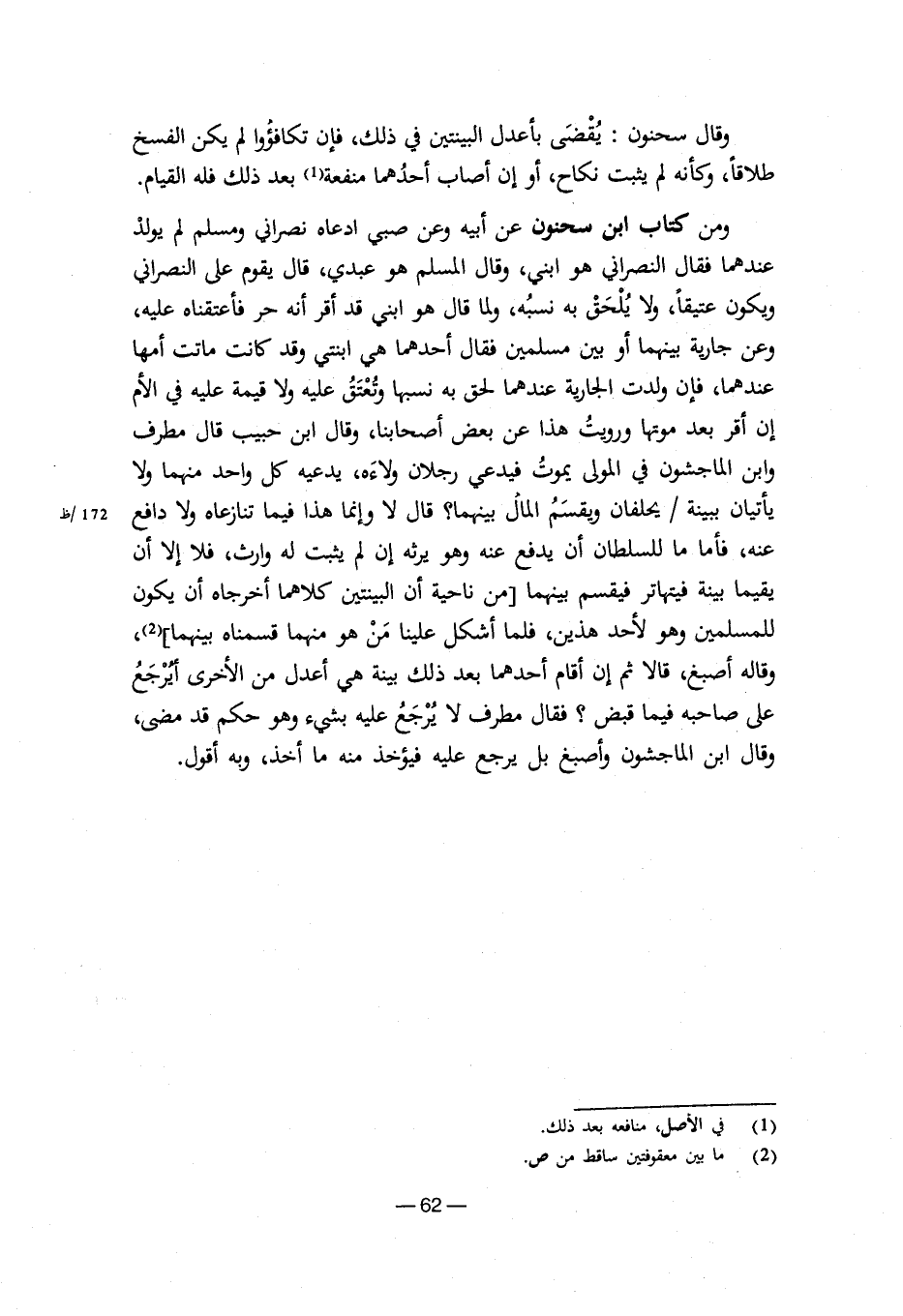 ومن كتاب ابن سحنون عن أبيه وعن صبي ادعاه نصراني ومسلم لم يولد عندهما لحق به نسبها وتعتق عليه ولا قيمة عليه في الأم إن أقر بعد موتها ورويت هذا عن بعض أصحابنا، وقال ابن حبيب قال مطرف وابن الماجشون في المولي يموت فيدعي رجلان ولاءه، يدعيه كل واحد منهما ولا يأتيان ببينة / يحلفان ويقسم المال بينهما؟ قال لا وإنما هذا فيها تنازعاه ولا دافع عنه، فأما ما للسلطان أن يدفع عنه وهو يرثه إن لم يثبت له وارث، فلا إلا أن يقيما بينةفيتهاتر بينهما [من ناحية أن البيتين كلاهما آخرجاه أن يكون للمسلمين وهو لأحد هذين، فلما أشكل علينا من هو منهما قسمناه بينهما] (¬2) وقاله أصبغ، قالا ثم إن أقام أحدهما بعد ذلك بينة عي أعدل من الأخري أيرجع علي صاحبه فيما قبض؟ فقال مطرف لا يرجع عليه بشئ وهو حكم قد مضي، وقال ابن الماجشون وأصبغ بل يرجع عليه فيؤخذ منه ما أخذ، وبه أقول.