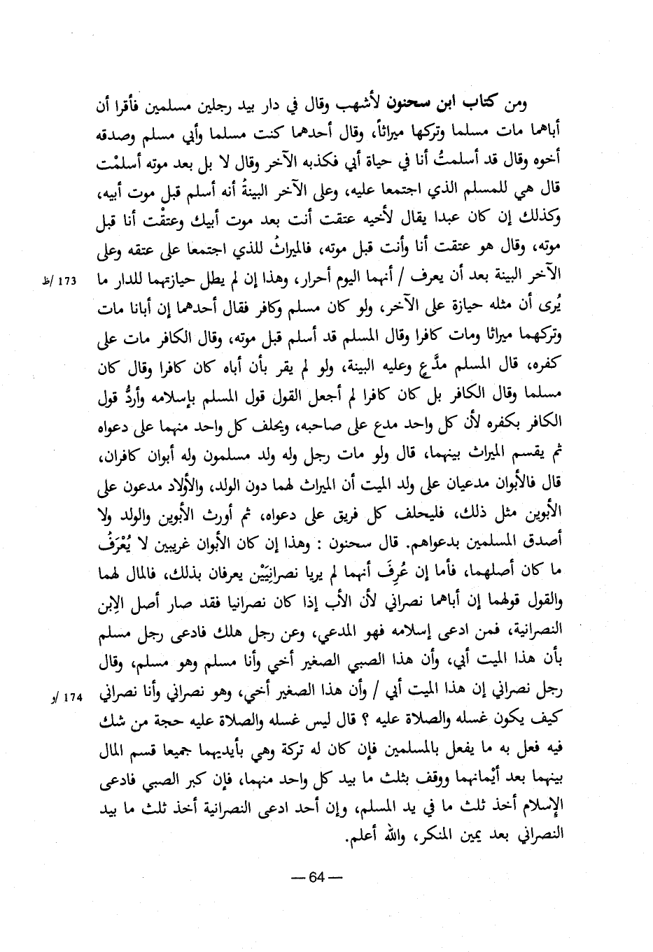 ومن كتاب ابن سحنون لأشهب وقال في داربيد رجلين مسلمين فأقرا أن أباهما مات مسلما وتركها ميراثاً، وقال أحدهما كنت مسلما وأبي مسلم وصدقه أخوه وقال قد أسلمت أنا في حياة أبي فكذبه الآخر وقال لا بل بعد موته أسلمت قال هي للمسلم الذي اجتمعا عليه، وعلي الآخر البينة أنه أسلم قبل موت أبيه، وكذلك إن كان عبدا يقال لأخيه عتقت أنت بعد موت أبيك وعتقت أنا قبل موته، وقال هو عتقت أنا وأنت قبل موته، فالميراث للذي اجتمعا علي عتقه وعلي الآخر البينة بعد أن يعرف/ أنهما اليوم أحرار، وهذا إن لم يطل حيازتهما للدار ما يري أن مثله حيازة علي الآخر، ولو كان مسلم وكافر فقال أحدهما إن أبانا مات وتركهما ميراثا ومات كافرا وقال المسلم قد أسلم قبل موته، وقال الكافر مات علي كفره، قال المسلم مدع وعليه البينة، ولو لم يقر بأن أباه كان كافرا وقال كان مسلما وقال الكافر بل كان كافرا لم أجعل القول قول المسلم بإسلامه وأرد قول الكافر بكفره لأن كل واحد مدع علي صاحبه، ويحلف كل واحد منهما علي دعواه ثم يقسم الميراث بينهما، قال ولو مات رجل وله مسلمون وله أبوان كافران، قال فالأبوان مدعيان علي ولد الميت أن الميراث لهما دون الولد، والأولاد مدعون علي الأبوين مثل ذلك، فليحلف كل فريق علي دعواه، ثم أورث الأبوين والوالد ولا أصدق المسلمين بدعواهم. قال سحنون: وهذا إن كان الأبوان غريبين لا يعرف ما كان أصلهما، فأما إن عرف أنهما لم يريا نصرانيين يعرفان بذلك، فالمال لهما والقول قولهما إن أباهما نصراني لأن الأب إذا كان نصرانيا فقد صار أصل الابن النصرانية، فمن ادعي إسلامه فهو المدعي، وعن رجل هلك فادعي رجل مسلم بأن هذا الميت أبي، وأن هذا الصبي الصغير أخي وأنا مسلم وهو مسلم، وقال رجل نصراني إن هذا الميت أبي / وأن هذا الصغير أخي، وهو نصراني وأنا نصراني كيف يكون غسله والصلاة عليه؟