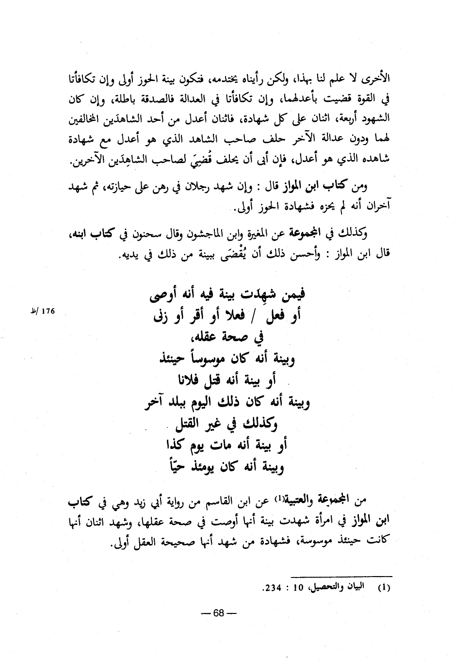الأخري لا علم لنا بهذا، ولكن رأيناه يختدمه، فتكون بينة الحوز أولي وإن تكافأتا في القوة قضيت بأعدلهما، وإن تكافأتا في العدالة فالصدقة باطلة، وإن كان الشهود أربعة, اثنان علي كل شهادة، فاثنان أعدل من أحد الشاهدين المخالفين لهما ودون عدالة الآخر حلف صاحب الشاهد الذي هو أعدل مع شهادة شاهده الذي هو أعدل، فإن أبي أن يحلف قضي لصاحب الشاهدين الآخرين.