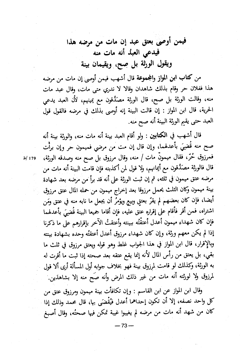 من كتاب ابن المواز والمجموعة قال أشهب فيمن أوصي إن مات من مرضه هذا ففلان حر وقام بذلك شاهدان وقالا لا ندري متي مات، وقال عبد مات منه، وقالت الورثة بل صح، قال الورثة مصدقون مع يمينهم، لأن العبد يدعي الحرية، قال ابن المواز: إن قالت البينة إنه أوصي بذلك في مرضه فالقول قول العبد حتي يقيم الورثة البينة أنه صح منه.