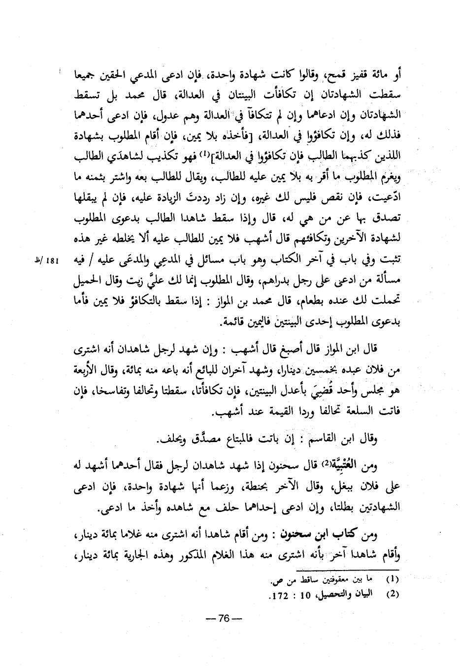 أو مائة قفيز قمح، وقالوا كانت شهادة واحدة، فإن ادعي المدعي الحقين جميعا شقطت الشهادتان إن تكافأت البينتان في العدالة، قال محمد بل تسقط الشهادتان وإن ادعاهما وإن لم تتكافأ في العدالة وهم عدول، فإن ادعي أحدهما فذلك له، وإن تكافؤوا في العدالة، [فأخذه بلا يمين، فإن أقام المطلوب بشهادة اللذين كذبهما الطالب فإن تكافؤوا في العدالة] (¬1) فهو تكذيب لشاهدي الطالب ويغرم المطلوب ما أقر به بلا يمين عليه للطالب، ويقال للطالب بعه واشتر بثمنه ما ادعيت، فإن نقص فليس لك غيره، وإن زاد رددت الزيادة عليه، فإن لم يبقلها تصدق بها عن من هي له، قال وإذا سقط شاهدا الطالب بدعوي المطلوب لشهادة الآخرين وتكافئهم قال أشهب فلا يمين للطالب عليه ألا يخلطه غير هذه تثبت وفي باب في آخر الكتاب وهو باب مسائل في المدعي والمدعي عليه / فيه مسألة من ادعي علي رجل بدارهم، وقال المطلوب إنما لك علي زيت وقال الحميل تحملت لك عنده بطعام، قال محمد بن المواز: إذا سقط بالتكافؤ فلا يمين فأما بدعوي المطلوب إحدي البينتين فاليمين قائمة.