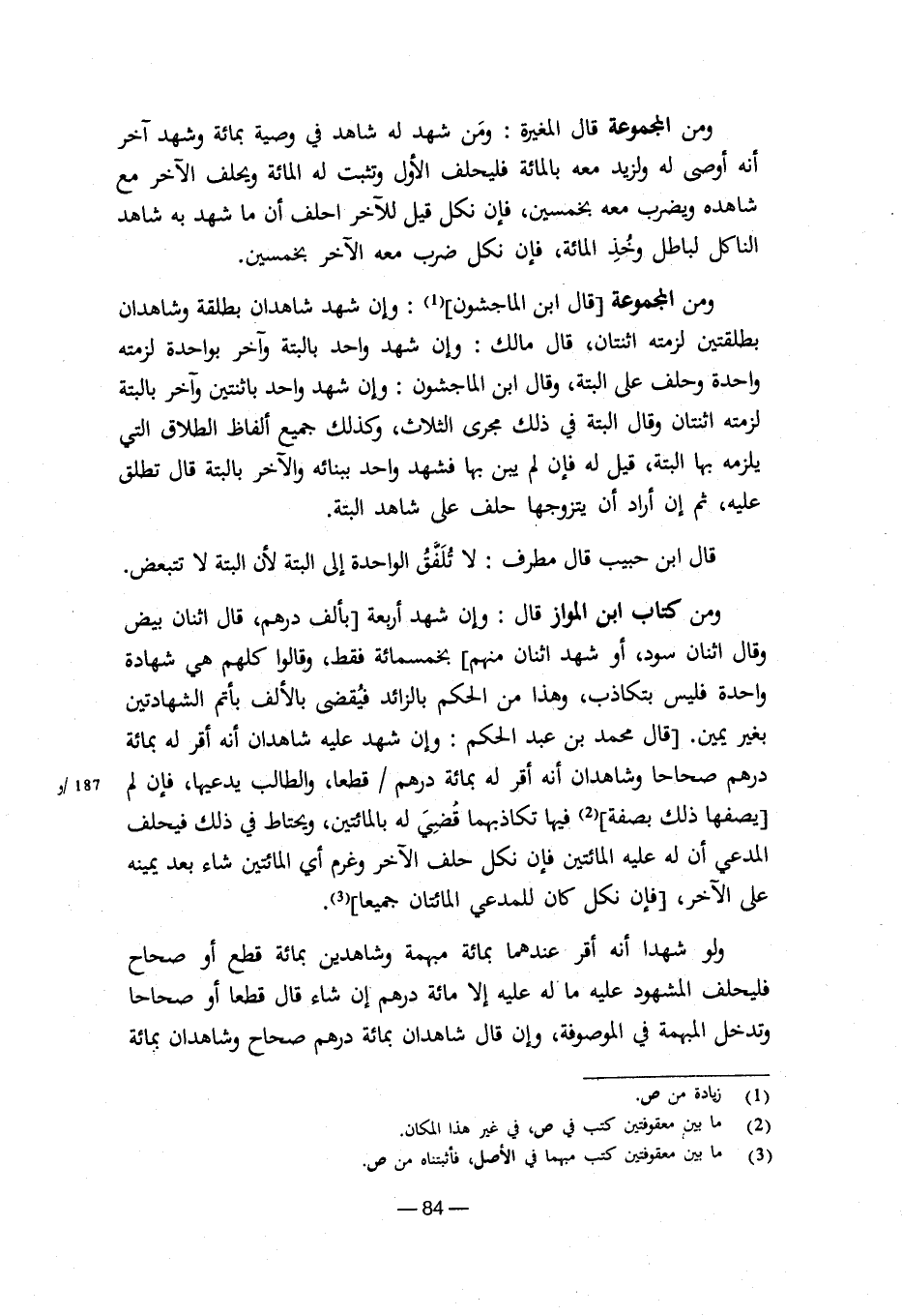 ومن المجموعة قال المغيرة: ومن شهد له شاهد في وصية بمائة وشهد آخر أنه أوصي له ولزيد معه بالمائه فليحلف الأول وتثبت له المائة ويحلف الآخر مع شاهده ويضرب معه بخمسين، فإن نكل قيل للآخر احلف أن ما شهد به شاهد الناكل لباطل وخذ المائة، فإن نكل ضرب معه الآخر بخمسين.