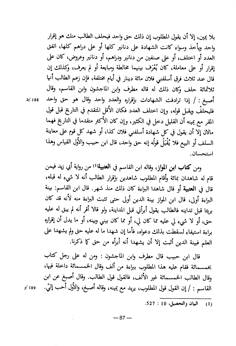قال ابن حبيب قال مطرف وابن الماجشون: ومن له علي رجل كتاب بخمسمائة فقام عليه هذا المطلوب ببراءة من ألف وقال الخمسمائة داخلة فيها، وقال الطالب الخمسمائة غير الألف، فالقول قول الطالب. وقال أصبغ عن ابن القاسم: / إن القول قول المطلوب، يريد مع يمينه، وقاله أصبغ، والأول أحب إلي.