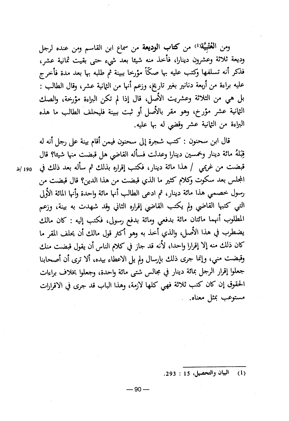 ومن العتبية (¬1) من كتاب الوديعة من سماع ابن القاسم ومن عنده لرجل وديعة ثلاثة وعشرون دينارا، فأخذ منه شيئا بعد شئ حتي بقيت ثمانية عشر، فذكر أنه تسلفها وكتب عليه بها صكاً مؤرخاً ببينة ثم طلبه بها مدة فأخرج عليه براءة من أربعة دنانير بغير تاريخ، وزعم أنها من الثانية عشر، وقال الطالب: بل هي من الثلاثة وعشرين الأصل، قال إذا لم تكن البراءة مؤرخة، والصك الثمانية عشر مؤرخ، وهو مقر بالأصل أو ثبت ببينة فليحلف الطالب ما هذه البراءة من الثمانية عشر وقضي له بها عليه.