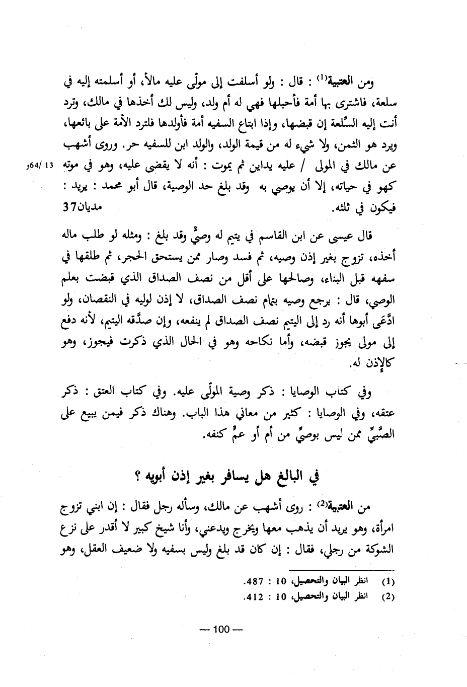 من العتبية: روى أشهب عن مالك، وسأله رجل فقال: إن ابني تزوج امرأة، وهو يريد أن يذهب معها ويخرج ويدعني، وأنا شيخ كبير لا أقدر على نزع الشوكة من رجلي، فقال: إن كان قد بلغ وليس بسفيه ولا ضعيف العقل، وهو