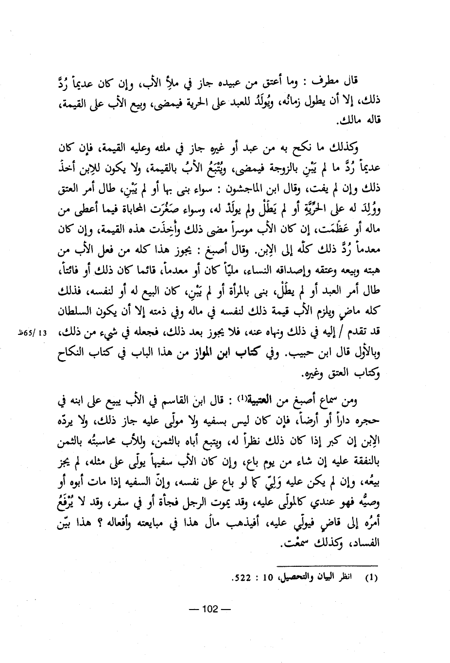 وكذلك ما نكح به من عبد أو غيره جاز في ملئه وعليه، فإن كان عديما رد ما لم يبن بالزوجة فيمضى، ويتبع الأب بالقيمة، ولا يكون للابن أخذ ذلك وإن لم يفت، وقال ابن الماجشون: سواء بني بها أو لم يبن، طال أمر العتق وولد له على الحرية أو لم يطل ولم يولد له، وسواء صغيرت المحاباة فيما أعطى من ماله أو عظمت، إن كان الأب موسرا مضى ذلك وأخذت هذه القيمة، وإن كان معدما رد ذلك كله إلى الابن. وقال أصبغ: يحوز هذا كله من فعل الأب من هبته وبيعه وعتقه وإصداقه النساء، مليا كان أو معدما، قائما كان ذلك أو فائتا، طال أمر العبد أو لم يطل، بني بالمرأة أو لم يبن، كان البيع له أو لنفسه، فذلك كله ماض ويلزم الأب قيمة ذلك لنفسه في ماله وفي ذمته إلا أن يكون السلطان قد تقدم/إليه في ذلك ونهاه عنه، فلا يجوز بعد ذلك، فجعله في شيء من ذلك، وبالأول قال ابن حبيب. وفي كتاب ابن المواز من هذا الباب في النكاح وكتاب العتق وغيره.