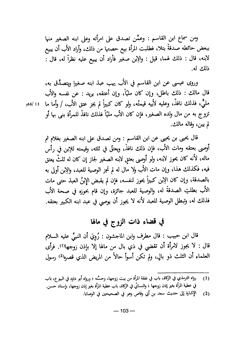 قال ابن حبيب: قال مطرف وابن الماجشون: روي أن النبي عليه السلام قال: لا يجوز لامرأة أن تقضي في ذي بال من مالها إلا بإذن زوجها. فرأى العلماء أن الثلث ذو بال، ولم تكن أسوأ حالا من المريض الذي قصره رسول