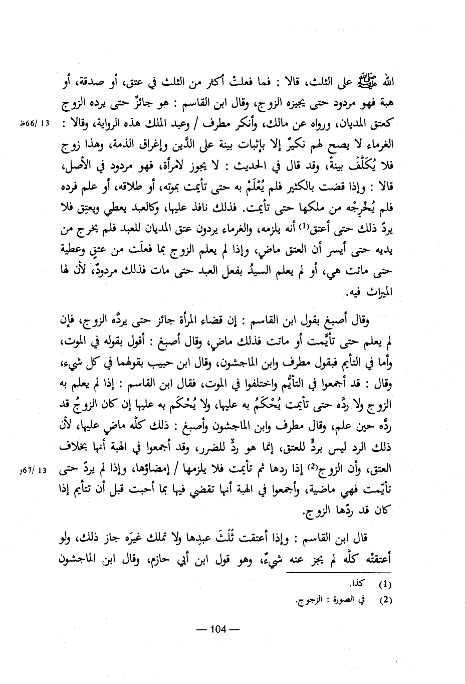 الله صلى الله عليه وسلم على الثلث: فما فعلت أكثر من الثلث في عتق، أو صدقة، أو هبة فهو مردود حتى يجيزه الزوج، وقال ابن القاسم: هو جائز حتى يرده الزوج كعتق المديان، ورواه عن مالك، وأنكر مطرف/وعبد الملك هذه الرواية، وقالا: الغرماء لا يصح لهم نكير إلا بإثبات بينة على الدين وإغراق الذمة، وهذا زوج فلا يكلف بينة، وقد قال في الحديث: لا يجوز لامرأة، فهو مردود في الأصل، قالا: وإذا قضت بالكثير فلم يعلم به حتى تأيمت بموته، أو طلاقه، أو علم فرده فلم يخرجه من ملكها حتى تأيمت. فذلك نافذ عليها، وكالعبد يعطي ويعتق فلا يرد ذلك حتى أعتق أنه يلزمه، والغرماء يردون عتق المديان للعبد فلم يخرج من يديه حتى أيسر أن العتق ماض، وإذا لم يعلم الزوج بما فعلت من عتق وعطية حتى ماتت هي، أو لم يعلم السيد بفعل العبد حتى مات فذلك مردود، لأن لها الميراث فيه.