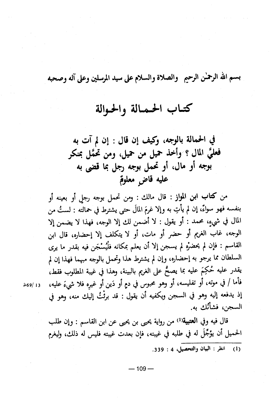 في الحمالة بالوجه، وكيف إن قال: إن لم آت به فعلي المال؟ وأخذ حميل من حميل، ومن تحمل بمنكر بوجه أو مال، أو تحمل بوجه رجل بما قضى به عليه قاض معلوم