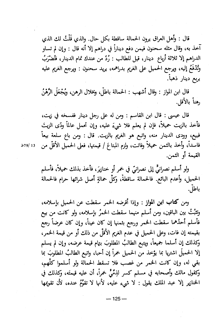 قال: وأهل العراق يرون الحمالة ساقطة بكل حال. والذي قلت لك الذي آخذ به، وقال مثله سحنون فيمن دفع دينارا في دراهم إلا أنه قال: وإن لم تساو الدراهم إلا ثلاثة أرباع دينار، قيل للطالب: رد من عندك الدينار، فتضرب وتدفع إليه، ويرجع الحميل على الغريم بدراهمه، يريد سحنون: ويرجع الغريم عليه بربع دينار ذهبا.