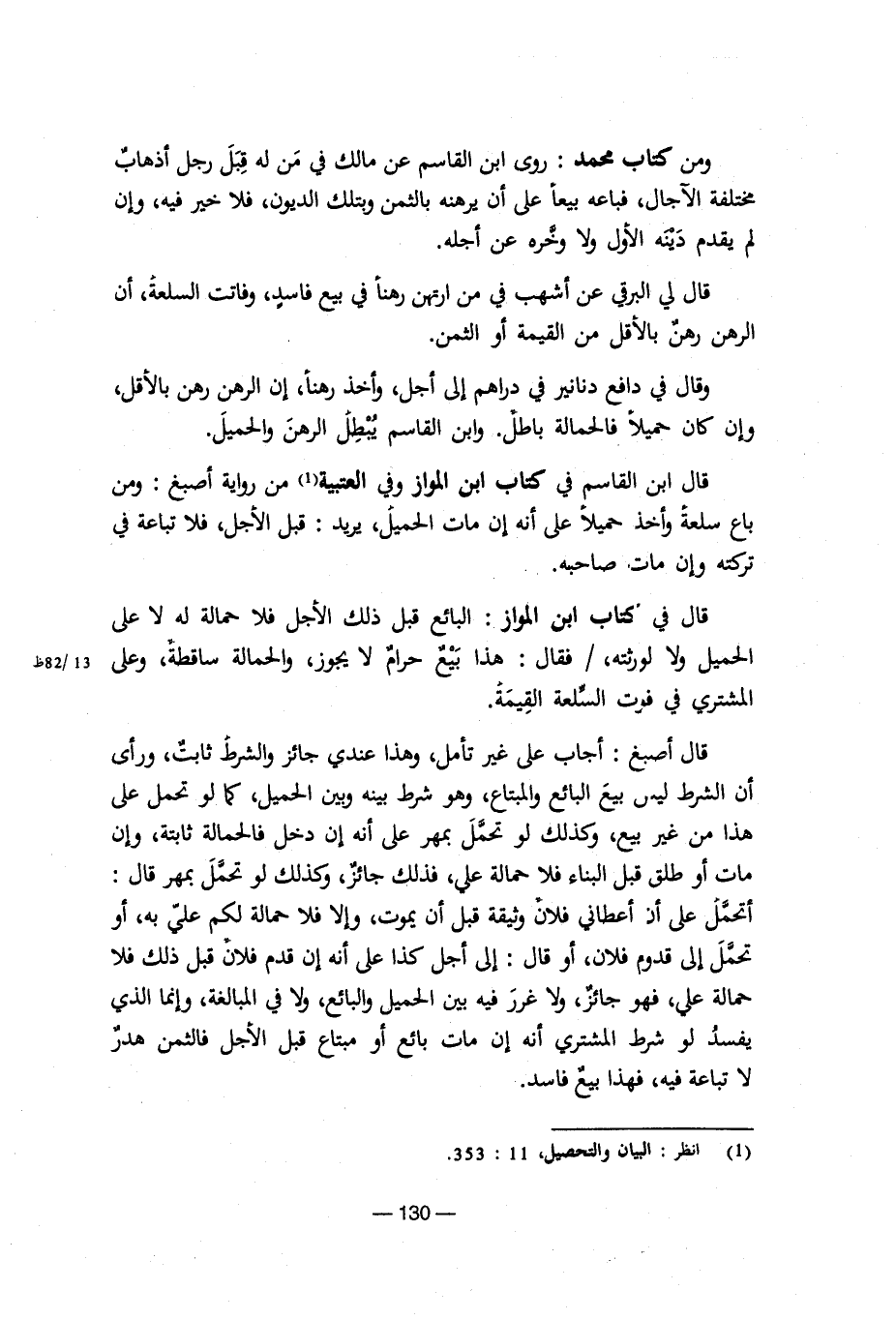 قال أصبغ: أجاب على غير تأمل، وهذا عندي جائز والشرط ثابت، ورأى أن الشرط ليس بيع البائع والمبتاع، وهو شرط بينه وبين الحميل، كما لو تحمل على هذا من غير بيع، وكذلك لو تحمل بمهر على أنه إن دخل فالحمالة ثابتة، وإن مات أو طلق قبل البناء فلا حمالة علي، فذلك جائز، وكذلك لو تحمل بمهر قال: أتحمل على أن أعطاني فلان وثيقة قبل أن يموت، وإلا فلا حمالة لكم علي به، أو تحمل إلى قدوم فلان، أو قال: إلى أجل كذا على أنه إن قدم فلان قبل ذلك فلا حمالة علي، فهو جائز، ولا غرر فيه بين الحمل والبائع، ولا في المبالغة، وإنما الذي يفسد لو شرط المشتري أنه إن مات بائع أو مبتاع قبل الأجل فالثمن هدر لا تباعة فيه، فهذا بيع فاسد.