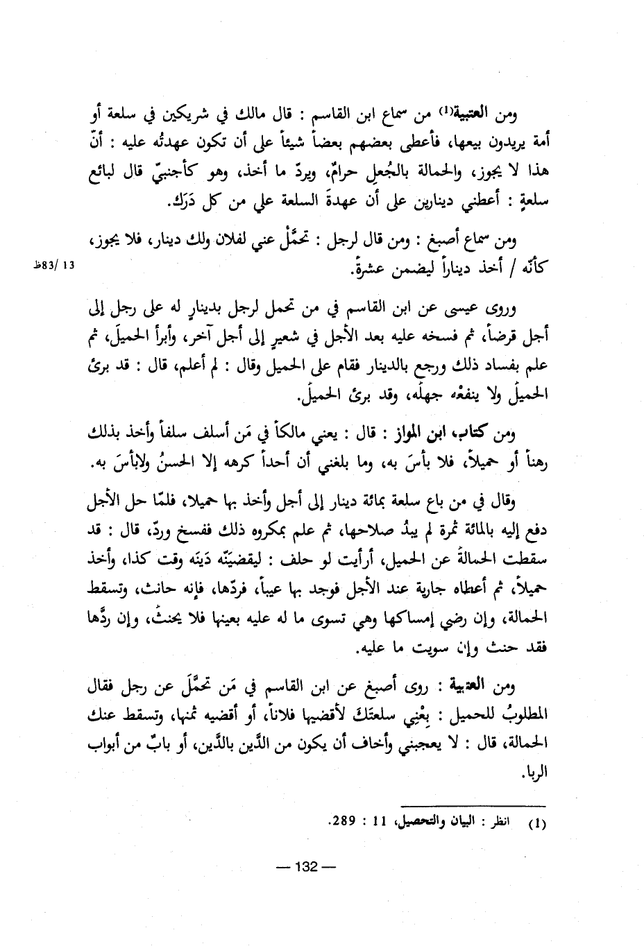 ومن العتبية: روى أصبغ عن ابن القاسم في من تحمل عن رجل فقال المطلوب للحميل: بعني سلعتك لأقضيها فلانا، أو أقضيه ثمنها، وتسقط عنك الحمالة، قال: لا يعجبني وأخاف أن يكون من الدين بالدين، أو باب من أبواب الربا.
