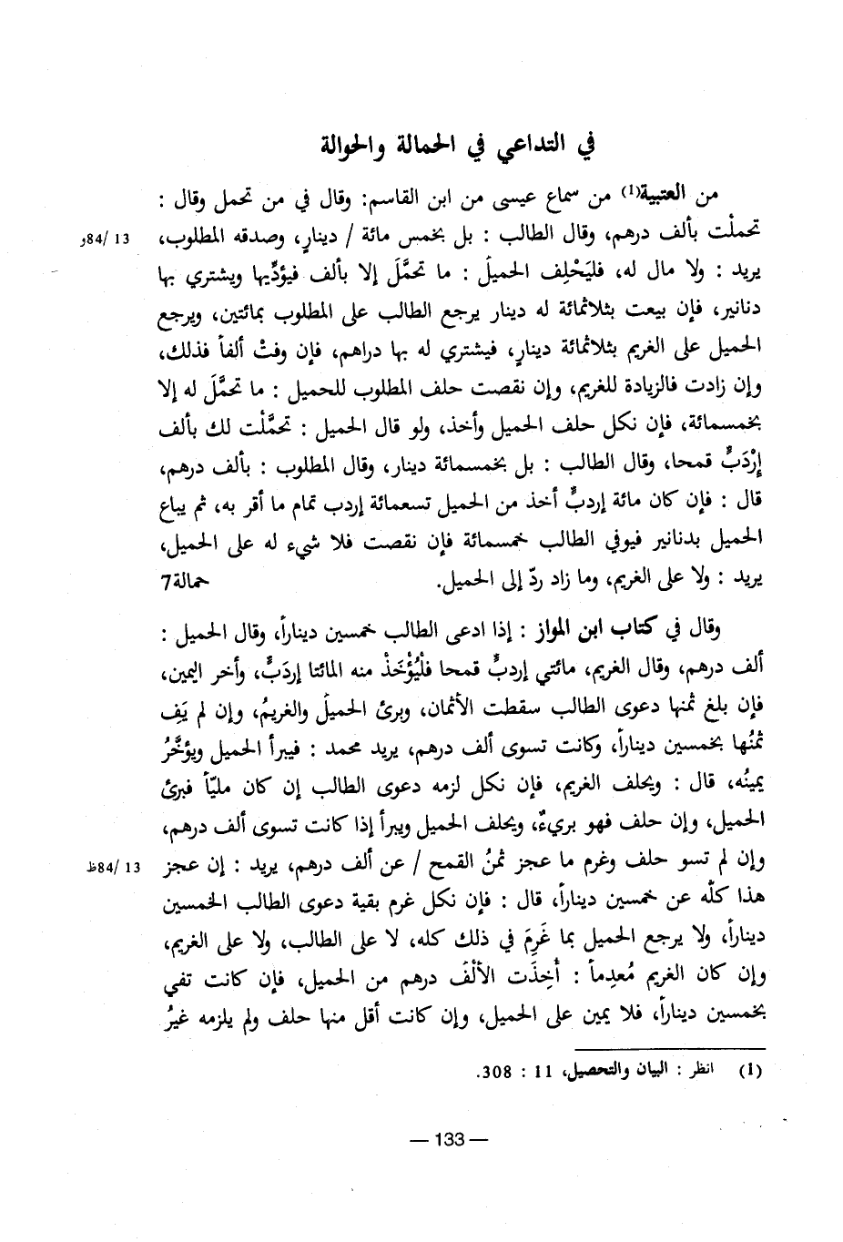 من العتبية من سماع عيسى من ابن القاسم: وقال في من تحمل وقال: تحملت بألف درهم، وقال الطالب: بل بخمس مائة/دينار، وصدقه المطلوب، يريد: ولا مال له، فليحلف الحميل: ما تحمل إلا بألف فيؤديها ويشتري بها دنانير، فإن بيعت بثلاثمائة له دينار يرجع الطالب على المطلوب بمائتين، ويرجع الحميل على الغريم بثلاثمائة دينار، فيشتري له بها دراهم، فإن وفت ألفا فذلك، وإن زادت فالزيادة للغريم، وإن نقصت حلف المطلوب للحميل: ما تحمل له إلا بخمسمائة، فإن نكل حلف الحميل وأخذ، ولو قال الحميل: تحملت لك بألف إردب قمحا، وقال الطالب: بل بخمسمائة دينار، وقال المطلوب: بألف درهم، قال: فإن كان مائة إردب أخذ من الحميل تسعمائة إردب تمام ما أقر به، ثم يباع الحميل بدنانير فيوفي الطالب بخمسمائة فإن نقصت فلا شيء له على الحميل، يريد: ولا على الغريم، وما زاد رد إلى الحميل. ... ... ... حمالة
