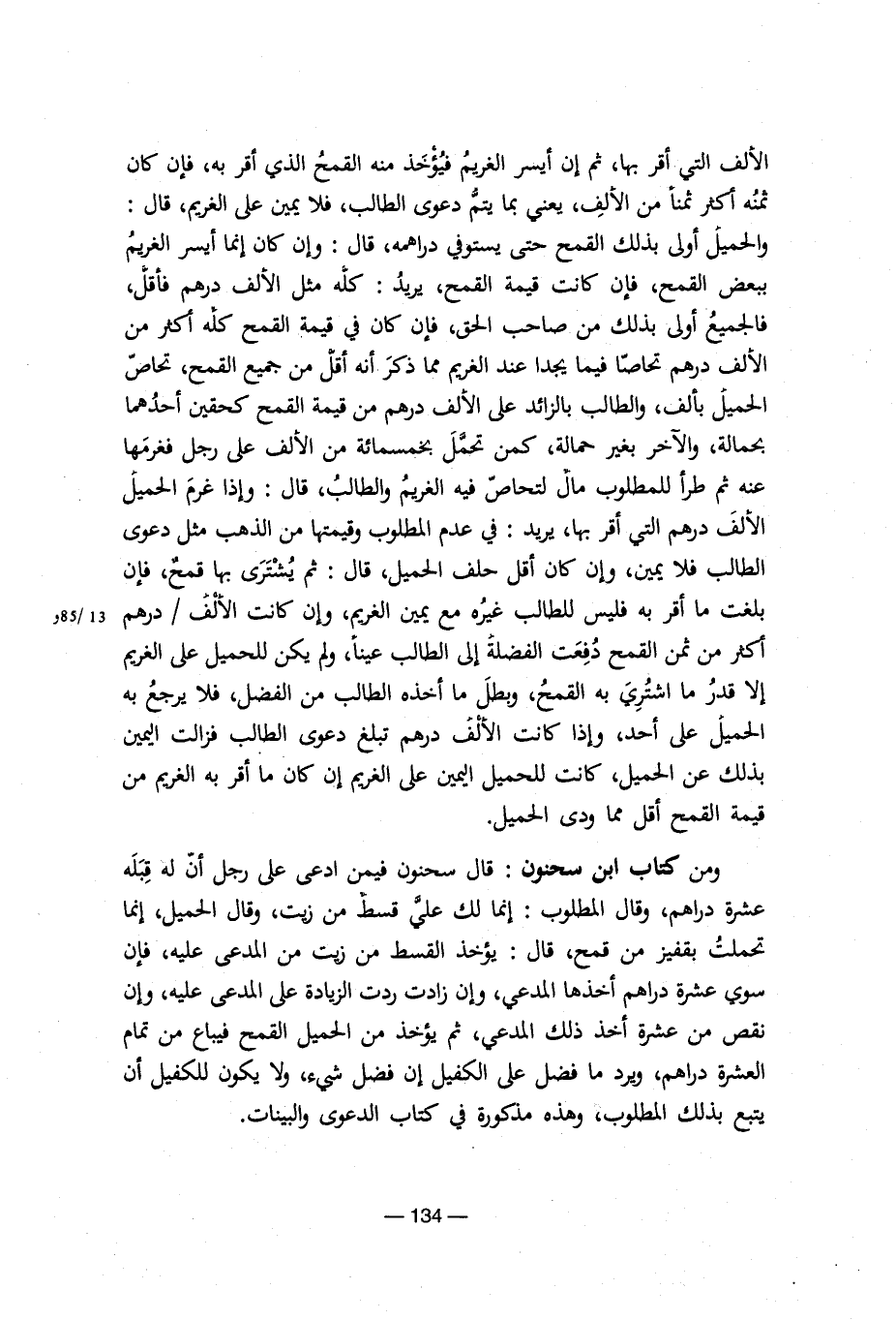 الألف التي أقر بها، ثم إن أيسر الغريم فيؤخذ منه القمح الذي أقر به، فإن كان ثمنه أكثر من الألف، يعني بما يتم دعوى الطالب، فلا يمين على الغريم، قال: والحميل أولى بذلك القمح حتى يستوفي دراهمه، قال: وإن كان إنما أيسر الغريم ببعض القمح، فإن كانت قيمة القمح، يريد: كله مثل الألف درهم فأقل، فالجميع أولى بذلك من صاحب الحق، فإن كان في قيمة القمح كله أكثر من الألف درهم تحصا فيما يجدا عند الغريم مما ذكر أنه أقل من جميع القمح، تحاص الحميل بألف، والطالب بالزائد على الألف درهم من قيمة القمح كحقين أحدهما بحمالة، والآخر بغير حمالة، كمن تحمل بخمسمائة من الألف على رجل فغرمها عنه ثم طرأ للمطلوب مال لتحاص فيه الغريم والطالب، قال: وإذا غرم الحميل الألف درهم التي أٌر بها، يريد: في عدم المطلوب وقيمتها من الذهب مثل دعوى الطالب فلا يمين، وإن كان أقل حلف الحميل، قال: ثم يشتري بها قمح، فإن بلغت ما أقر به فليس للطالب غيره مع يمين الغريم، وإن كانت الألف/درهم أكثر من ثمن القمح دفعت الفضلة إلى الطالب عينا، ولم يكن للحميل على الغريم إلا قدر ما اشتري به القمح، وبطل ما أخذه الطالب من الفضل، فلا يرجع به الحميل على أحد، وإذا كانت الألف درهم تبلغ دعوى الطالب فزالت اليمين بذلك عن الحميل، كانت للحميل اليمين على الغريم إن كان ما أقر به الغريم من قيمة القمح أقل مما ودى الحميل.