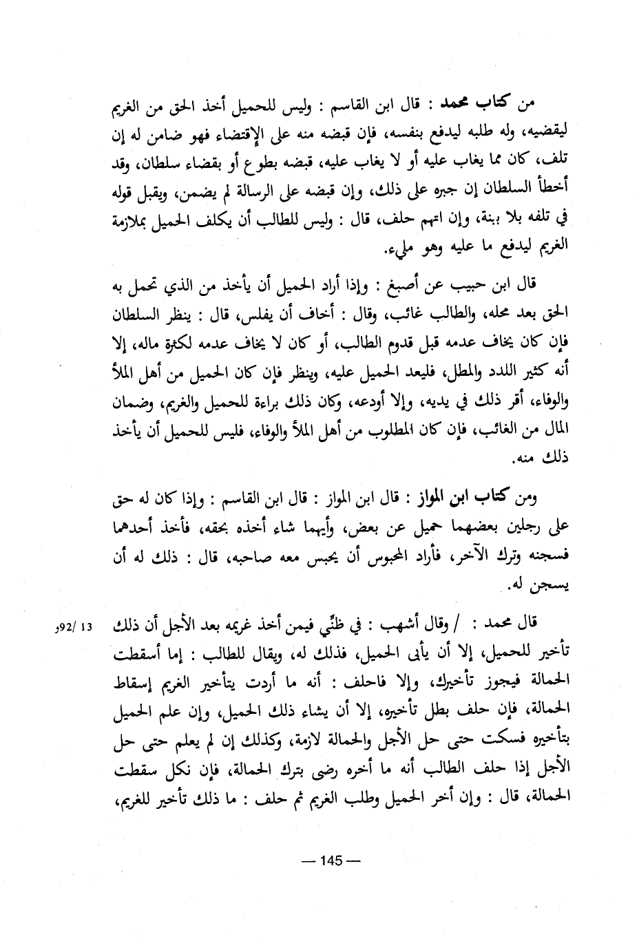 قال ابن حبيب عن أصبغ: وإذا أراد الحميل أن يأخذ من الذي تحمل به الحق بعد محله، والطالب غائب، وقال: أخاف أن يفلس، قال: ينظر السلطان فإن كان يخاف عدمه قبل قدوم الطالب، أو كان لا يخاف عدمه لكثره ماله، إلا أنه كثير اللدد والمطل، فليعد الحميل عليه، وينظر فإن كان الحميل من أهل الملأ والوفاء، أقر ذلك في يديه، وإلا أودعه، وكان ذلك براءة للحميل والغريم، وضمان المال فمن الغائب، فإن كان المطلوب من أهل الملأ والوفاء، فليس للحميل أن يأخذ ذلك منه.