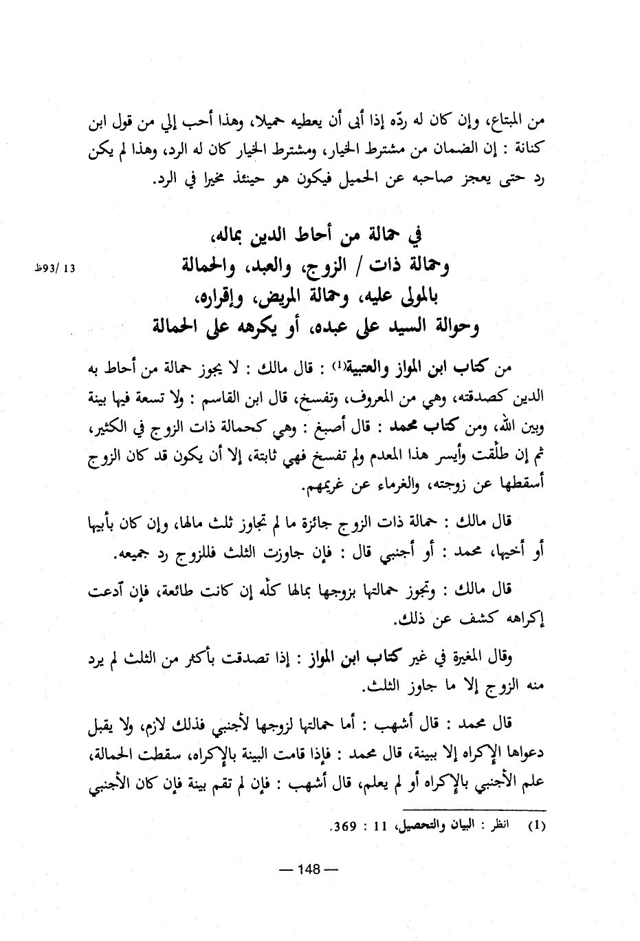 في حمالة من أحاط الدين بماله، وحمالة ذات/الزوج، والعبد، والحمالة بالمولى عليه، وحمالة المريض، وإقراره، وحوالة السيد على عبده، أو يكرهه على الحمالة