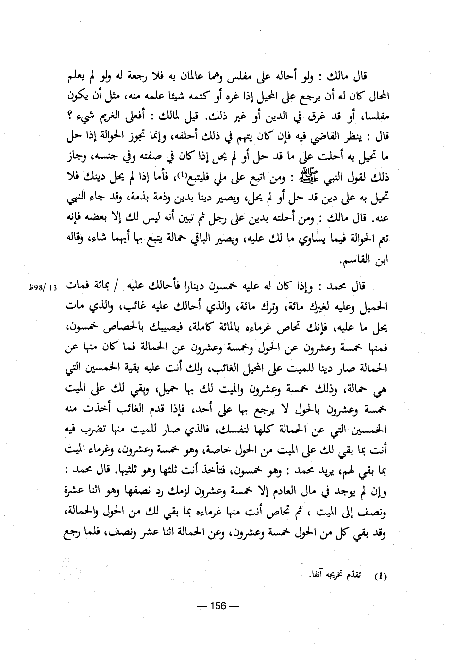 قال محمد: وإذا كان له عليه خمسون دينارا فأحالك عليه/بمائة فمات الحميل وعليه لغيرك مائة، وترك مائة، والذي أحالك عليه غائب، والذي مات يحل ما عليه، ف إنك تحاص غرماءه بالمائة كاملة، فيصيبك بالحصاص خمسون، فمنها خمسة وعشرون عن الحول وخمسة وعشرون عن الحمالة فما كان منها عن الحمالة صار دينا للميت على المحيل الغائب، ولك أنت عليه بقية الخمسين التي هي حمالة، وذلك خمسة وعشرون والميت لك بها حميل، وبقي لك على الميت خمسة وعشرون بالحول لا يرجع بها على أحد، فإذا قدم الغائب أخذت منه الخمسين التي عن الحمالة لنفسك، فالذي صار للميت منها تضرب فيه أنت بما بقي لك على الميت من الحول خاصة، وهو خمسة وعشرون، وغرماء الميت بما بقي لهم، يريد محمد: وهو خمسون، فتأخذ أنت ثلثها وهو ثلثيها. قال محمد: وإن لم يوجد في مال العادم إلا خمسة وعشرون لزمك رد نصفها وهو اثنا عشرة ونصف إلى الميت، ثم تحاص أنت منها غرماءه بما بقي لك من الحول والحمالة، وقد بقي كل من الحول خمسة وعشرون، وعن الحمالة اثنا عشر ونصف، فلما رجع