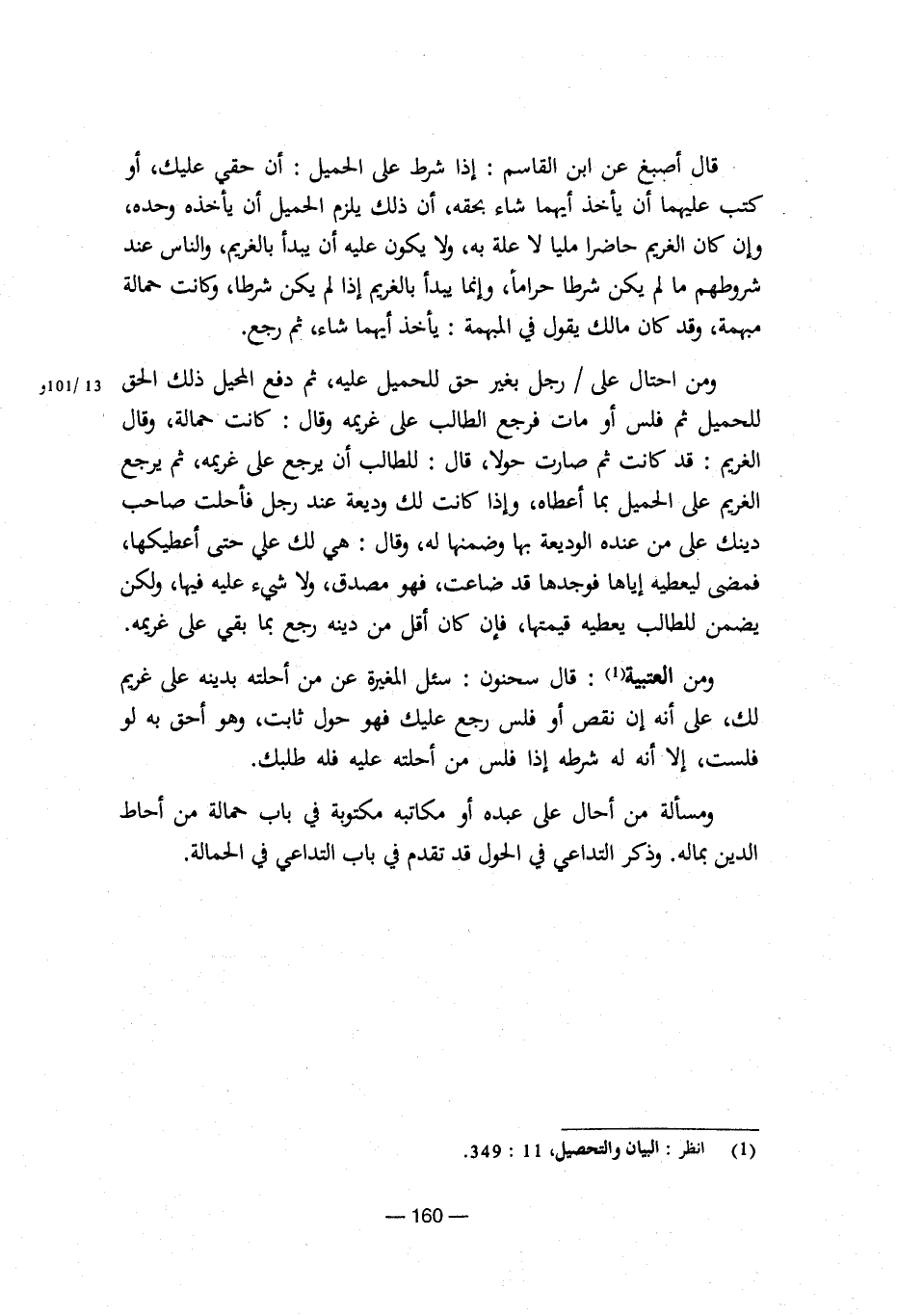 ومن العتبية: قال سحنون سئل المغيرة عن من أحلته بدينه على غريم لك، على أنه نقص أو فلس رجع عليك فهو حول ثابت، وهو أحق به لو فلست، إلا أنه له شرطه إذا فلس من أحلته عليه فله طلبك.