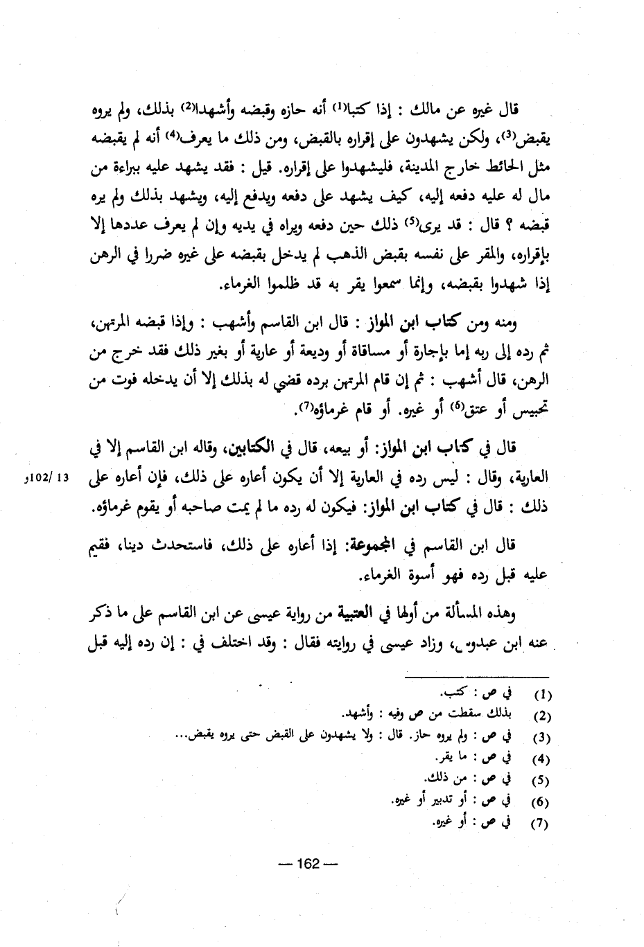 قال غيره عن مالك: إذا كتبا أنه حازه وقبضه وأشهد بذلك، ولم يروه يقبض، ولكن يشهدون على إقراره بالقبض، ومن ذلك ما يعرف أنه لم يقبضه مثل الحائط خارج المدينة، فليشهدوا على إقراره. قيل: فقد يشهد عليه ببراءة من مال له عليه دفعه إليه، كيف يشهد على دفعه ويدفع إليه، ويشهد بذلك ولم يره قبضه؟ قال: قد يرى ذلك حين دفعه ويراه في يديه وإن لم يعرف عددها إلا بإقراره، والمقر على نفسه بقبض الذهب لم يدخل بقبضه على غيره ضررا في الرهن إذا شهدوا بقبضه، وإنما سمعوا يقر به قد ظلموا الغرماء.
