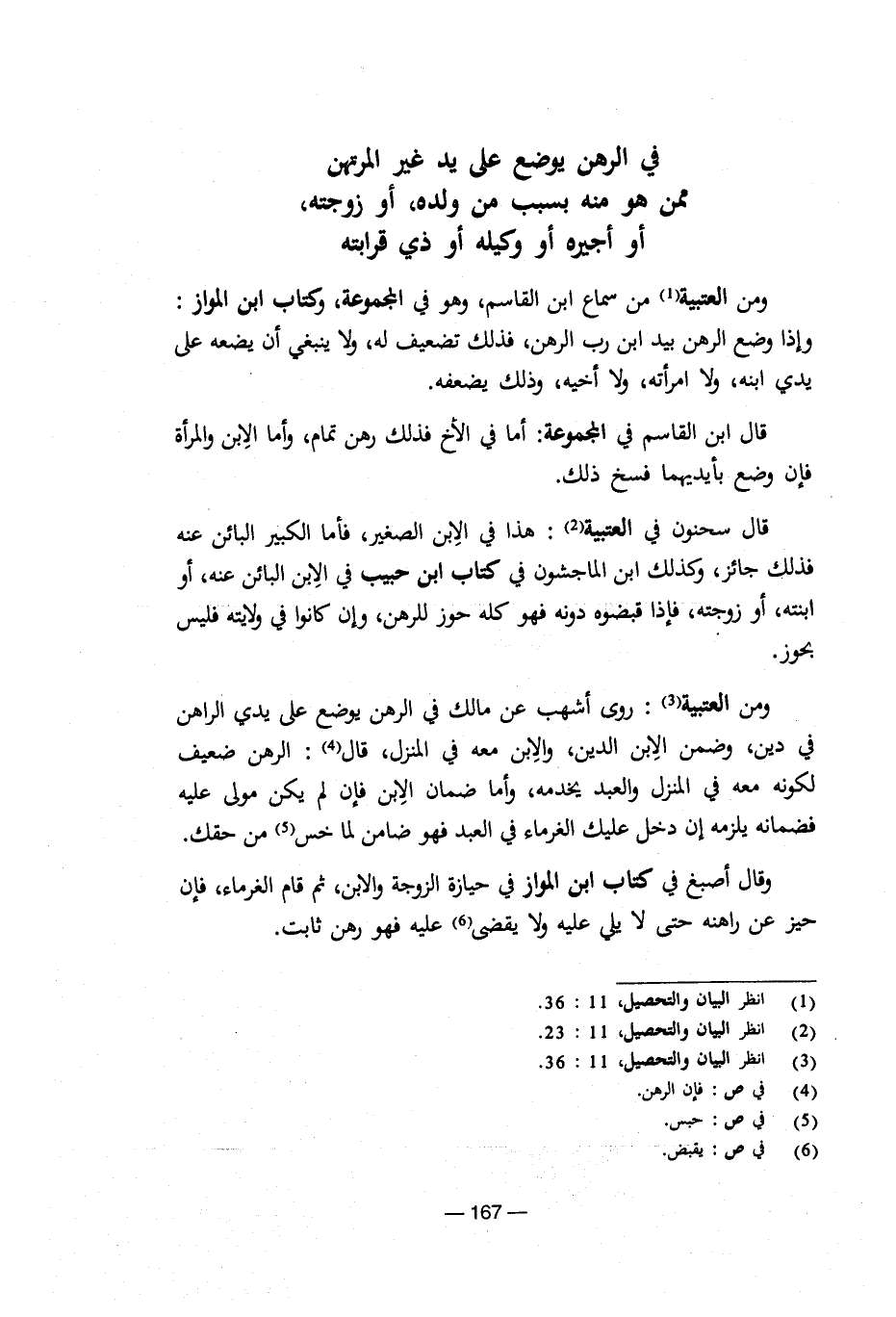 قال سحنون في العتبية: هذا في الابن الصغير، فأما الكبير البائن عنه فذلك جائز، وكذلك ابن الماجشون في كتاب ابن حبيب في الابن البائن عنه، أو ابنته، أو زوجته، فإذا قبضوه دونه كله حوز للرهن، وإن كانوا في ولايته فليس بحوز.