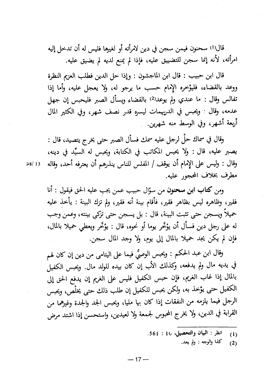 ومن كتاب ابن سحنون من سؤال حبيب عمن يجب عليه الحق فيقول: أنا فقير، وظاهره ليس بظاهر فقير، فأقام بينة أنه فقير، ولم تزل البينة: يأخذ عليه حميلا ويسجن حتى تثبت البينة، قال: بل يسجن حتى تزكي بينته، وعمن وجب له على رجل دين فسأل أن يؤخر يوما أو نحوه، قال: يؤخر ويعطي حميلا بالمال فإن لم يكن يجد حميلا بالمال إلى يوم، ولا وجد المال سجن.