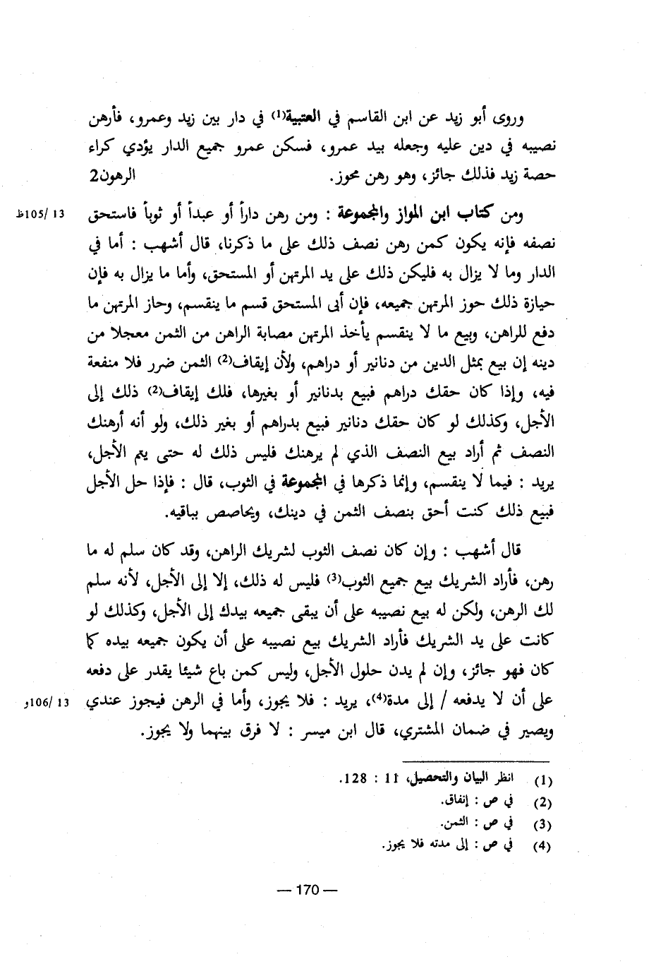قال أشهب: وإن كان نصف الثوب لشريك الراهن، وقد كان سلم له ما رهن، فأراد الشريك بيع جميع الثوب فليس له ذلك، إلا إلى الأجل، لأنه سلم لك الرهن، ولكن له بيع نصيبه على أن يبقي جميعه بيدك إلى الأجل، وكذلك لو كانت على يد الشريك فأراد الشريك بيع نصيبه على أن يكون جميعه بيده كما كان فهو جائز، وإن لم يدن حلول الأجل، وليس كمن باع شيئا يقدر على دفعه على أن لا يدفعه/إلى مدة، يريد: فلا يجوز، وأما في الرهن فيجوز عندي ويصير في ضمان المشتري، قال ابن ميسر: لا فرق بينهما ولا يجوز.