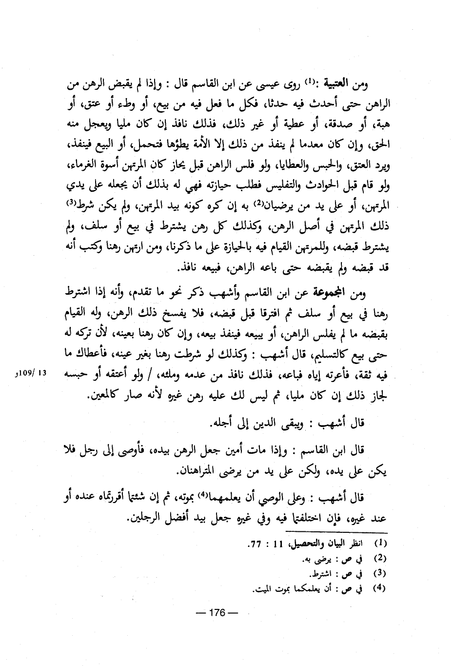 ومن العتبية: روى عيسى عن ابن القاسم قال: وإذا لم يقبض الرهن من الراهن حتى أحدث فقيه حدثا، فكل ما فعل فيه من بيع، أو وطء أو عتق، أو هبة، أو صدقة، أو عطية أو غير ذلك، فذلك نافذ إن كان مليا ويعجل منه الحق، وإن كان معدما لم ينفذ من ذلك إلا الأمة يطؤها فتحمل، أو البيع فينفذ، ويرد العتق، والحبس والعطايا، ولو فلس الراهن قبل يحاز كان المرتهن أسوة الغرماء، ولو قام قبل الحوادث والتفليس فطلب حيازته فهي له بذلك أن يجعله على يدي المرتهن، أو على يد من يرضيان به إن كره كونه بيد المرتهن، ولم يكن شرط ذلك المرتهن في أصل الرهن، وكذلك كل رهن يشترط في بيع أو سلف، ولم يشترط قبضه، وللمرتهن القيام بالحيازة على ما ذكرنا، ومن ارتهن رهنا وكتب أنه قد قبضه ولم يقبضه حتى باعه الراهن، فبيعه نافذ.