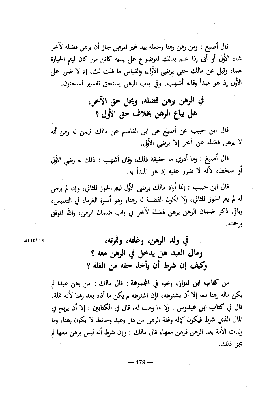 من كتاب ابن المواز، ونحو في المجموعة: قال مالك: من رهن عبدا لم يكن ماله رهنا معه إلا أن يشترطه، فإن اشترطه لم يكن ما أفاد بعد رهنا لأنه غلة. قال في كتاب ابن عبدوس: ولا ما وهب له، قال في الكتابين: إلا أن يربح في المال الذي شرط فيكون كماله وغلة الرهن من دار وعبد وحائط لا يكون رهنا، وما ولدت الأمة بعد الرهن فرهن معها، قال مالك: وإن شرط أنه ليس برهن معها لم يجز ذلك.