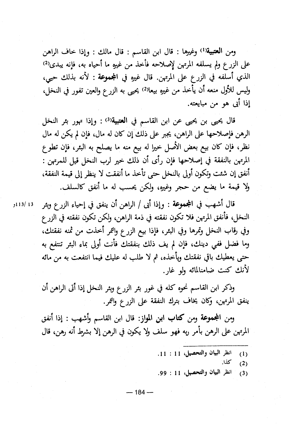 وذكر ابن القاسم نحوه كله فيغور بئر الزرع وبئر النخل إذا أتى الراهن أن ينفق المرتهن، وكن يخالف بترك النفقة على الزرع والتمر.