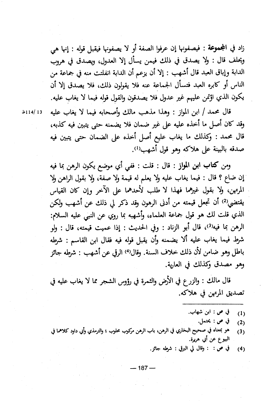 ومن كتاب ابن المواز: قال: قلت: ففي أي موضع يكون الرهن بما فيه إن ضاع؟ قال: فيما يغاب عليه ولا يعلم له قيمة ولا صفة، ولا بقول الراهن ولا يكون المرتهن، ولا بقول غيرهما فهذا لا طلب لأحدهما على الآخر وإن كان القياس يقتضي أن تجعل قيمته من أدنى الرهون وقد ذكر لي ذلك عن أشهب ولكن الذي قلت لك هو قول جماعة العلماء، وأشهبه بما روى عن النبي عليه السلام: الرهن بما فيه، قال أبو الزناد: وفي الحديث: إذا عميت قيمته، قال: ولو شرط فيما يغاب عليه ألا يضمنه وأن يقبل قوله فيه فقال ابن القاسم: شرطه باطل وهو ضامن لأن ذلك خلاف السنة. وقال الرقي عن أشهب: شرطه جائز وهو مصدق وكذلك في العارية.